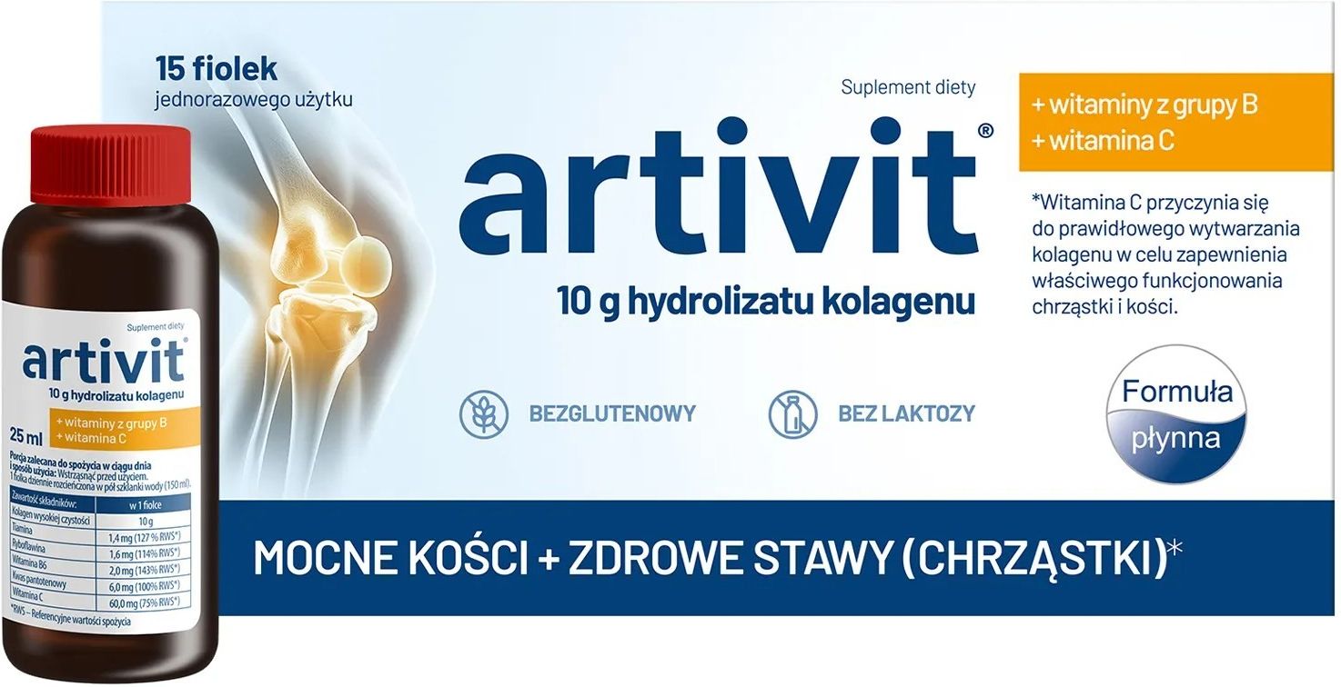 Artivit z witaminą C, kolagen na stawy w płynie Artivit z witaminą C to suplement diety z enzymatycznie hydrolizowanym kolagenem na stawy. Fiolki dla osób chcących zadbać o zdrowy wygląd skóry i stawów, szczególnie starszych oraz uprawiających sport. Masa netto 375 ml Składniki Co zawiera Artivit z witaminą C? Zawartość składników, w 1 fiolce, % ZDS*/ na fiolkę Enzymatycznie hydrolizowany kolagen wysokiej czystości, 10 g, -- Witamina B1, 1,4 mg, 127 % Witamina B2, 1,6 mg, 114 % Witamina B6, 2 mg, 143 % Witamina B5 ( kwas pantotenowy), 6 mg, 100 % Witamina C, 80 mg, 75 % *% RWS Referencyjne wartości spożycia Składniki: woda; hydrolizowany kolagen wysokiej czystości; fruktoza; kwas: kwas cytrynowy; chlorek sodu; substancja konserwująca: sorbinian potasu; kwas L-askorbinowy (witamina C); regulator kwasowości: wodorotlenek magnezu; aromat jabłkowy; substancja wypełniająca: glicerol; deksapantenol (kwas pantotenowy); chlorowodorek pirydoksyny (witamina B6); chlorowodorek tiaminy (tiamina); ryboflawina Właściwości składników Jakie właściwości mają składniki kolagenu do picia Artivit z witaminą C? Kolagen na stawy wzbogacony witaminą C. Płyn o delikatnym aromacie owocowym na wzmocnienie stawów. Witamina C przyczynia się do prawidłowego wytwarzania kolagenu i prawidłowego funkcjonowania kości. Tiamina, ryboflawina, kwas pantotenowy oraz witaminy B6 i C wspierają prawidłowy metabolizm energetyczny, pomagając organizmowi efektywnie przekształcać składniki odżywcze w energię potrzebną do codziennego funkcjonowania. Witamina B2 ryboflawina, kwas pantotenowy oraz witamina B6 pomagają zmniejszyć uczucie zmęczenia i znużenia. Zalecane dzienne spożycie Jak stosować kolagen do picia Artivit z witaminą C? Dorośli: 1 fiolka dziennie rozcieńczona w pół szklanki wody ok. 150 ml Jak długo należy stosować Artivit? Kolagen do picia na stawy stosuj codzienne przez okres minimum 2. miesięcy. Dodatkowe Mogą wystąpić różnice w kolorze zapachu i smaku, które nie wpływają na jakość produktu. Przechowuj w sposób niedostępny dla małych dzieci. Ostrzeżenia Nie należy przekraczać zalecanej porcji do spożycia w ciągu dnia. Dla utrzymania prawidłowego stanu zdrowia należy stosować zróżnicowaną dietę i prowadzić zdrowy tryb życia. Suplement diety nie może być stosowany jako substytut (zamiennik) zróżnicowanej diety. Suplement diety jest środkiem spożywczym, którego celem jest uzupełnienie normalnej diety. Suplement diety nie ma właściwości leczniczych. Przechowywać w sposób niedostępny dla małych dzieci. Kobiety w ciąży, karmiące, osoby starsze czy osoby przyjmujące leki przed zastosowaniem suplementu powinny skonsultować się z lekarzem lub farmaceutą. Nie należy stosować w przypadku nadwrażliwości na którykolwiek ze składników suplementu. Przed zastosowaniem produktu należy zapoznać się z dokładnymi informacjami podanymi na opakowaniu lub załączonej ulotce.