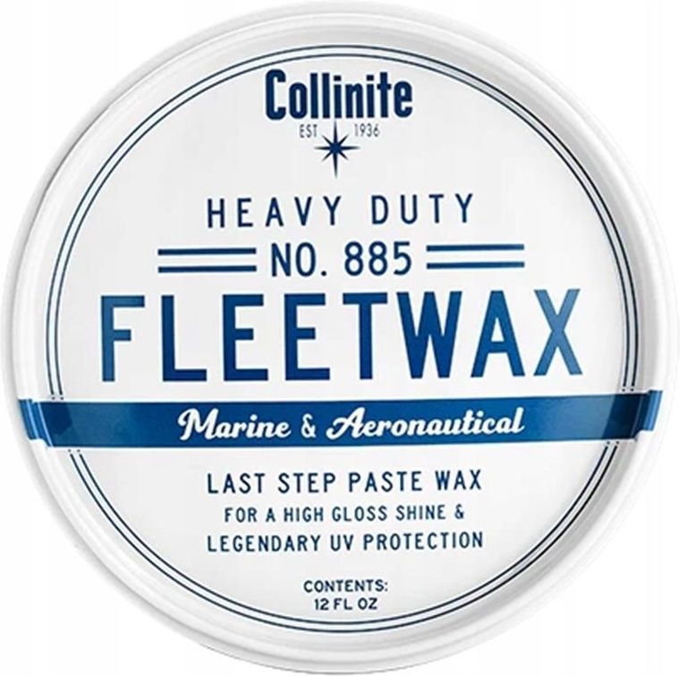 COLLINITE 885 Fleetwax Heavy Duty Paste to ekstremalnie trwały wosk w paście chroniący przed szkodliwym działaniem zanieczyszczeń środowiskowych, promieniowaniem UV, korozją, etc. Pozostawia wykończenie pełne blasku, wzmacnia połysk. Wosk przeznaczony do wszelkiego rodzaju powierzchni lakierowanych, metalowych, z włókna szklanego i innych. Nie zawiera cząsteczek ściernych, jest całkowicie bezpieczny dla wierzchniej warstwy lakieru. COLLINITE 885 Fleetwax Heavy Duty Paste jest szczególnie polecany do wszelkich pojazdów pływających (żaglówek, łodzi motorowych, skuterów, itp.) i latających, w żeglarstwie i aeronautyce. Sposób użycia: 1. Aplikować na ostudzoną powierzchnię. 2. Nakładać COLLINITE 885 Fleetwax Heavy Duty Paste na czystą i suchą powierzchnię za pomocą aplikatora. 3. Pozostawić produkt do wyschnięcia. 4. Wypolerować do połysku miękkim ręcznikiem z mikrofibry. W przypadku utlenionej lub trwale zabrudzonej powierzchni użyć COLLINITE 920 Fiberglass Boat Cleaner przed aplikacją wosku. Pojemność: 355 g