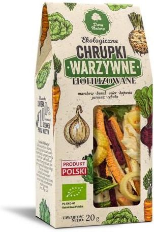 Składniki: Liofilizowane warzywa: marchew* 15%, burak* 15%, seler* 10%, papryka czerwona* 10%, papryka zielona* 10%, pomidor* 10%, koper włoski 10%, cebula* 5%, cukinia* 5%, ogórek* 5%, jarmuż* 5%. *Produkt rolnictwa ekologicznego. Wartość energetyczna 1501 kJ / 356 kcal; Tłuszcz 5,1g; w tym kwasy tłuszczowe nasycone 0,3g; Węglowodany 81g; w tym cukry 44g; Błonnik 13,4g; Białko 3 g; Sól 0g. Masa netto: 20g Właściwości i przeznaczenie: Liofilizowane chrupki warzywne to smaczna i naturalna przekąska, w skład której wchodzą warzywa pochodzące z upraw ekologicznych. Świetnie sprawdzi się jako zdrowa przekąska w domu, pracy czy szkole. Produkty liofilizowane zachowują w 90% swój naturalny kształt, barwę i aromat. Dzięki możliwości przeprowadzania procesu w niskich temperaturach, surowiec przygotowany metodą liofilizacji nie traci cennych witamin i olejków eterycznych. Stosowanie: Liofilizowane chrupki warzywne to smaczna i naturalna przekąska, w skład której wchodzą warzywa pochodzące z upraw ekologicznych. Świetnie sprawdzi się jako zdrowa przekąska w domu, pracy czy szkole. Przeciwwskazania: Nadwrażliwość lub alergia na którykolwiek ze składników produktu. Przechowywanie: Przechowywać w suchym, chłodnym i zaciemnionym miejscu. Producent: Dary Natury Sp. z o. o. Koryciny 73 17-315 Grodzisk