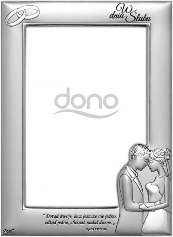 Ramka srebrna na zdjęcie z obrączkami i Parą Młodą. Podpisem "W dniu Ślubu" oraz cytatem "Dotąd dwoje, lecz jeszcze nie jedno, odtąd jedno, chociaż nadal dwoje". Ramka wyprodukowana została przez firmę Dono. Gwarantuje ona, iż przedmiot nabyty przez Państwa został wyprodukowany we Włoszech, zgodnie z kunsztem i tradycją obróbki metali szlachetnych. Ramka wykonana jest z blachy aluminium pokrytej warstwą srebra. Całość zabezpieczona jest warstwą lakieru, która chroni przed czynnikami zewnętrznymi. Wpływa to na bezproblemowe użytkowanie bez potrzeby częstego czyszczenia. Do czyszczenia zalecamy używanie wyłącznie czystych, miękkich ściereczek, a w przypadku zabrudzeń letniej wody. Nie należy stosować detergentów, alkoholu ani znajdujących się w sprzedaży środków i ściereczek do czyszczenia srebra, gdyż mogą one uszkodzić warstwę ochronną.