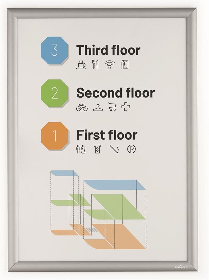 Aluminiowa rama zatrzaskowa A2 Wytrzymała aluminiowa rama zatrzaskowa to idealne rozwiązanie do szybkiej i łatwej wymiany informacji. Dzięki sprawdzonej technice składania, zmiana plakatu czy grafiki zajmuje zaledwie kilka sekund. Folia ochronna o niskim współczynniku odbicia światła, odporna na promieniowanie UV, zapewnia długotrwałą jakość wydruku. Odporny na uderzenia tylny panel z polistyrenu dodatkowo zabezpiecza zawartość. Ścięte narożniki nadają ramie estetyczny wygląd. W komplecie zestaw montażowy składający się ze śrub, kołków i czterech pasków samoprzylepnych. Mocowanie – w zależności od preferencji – możliwe w poziomie i w pionie. Łącznie z zestawem montażowym, szablonem do wiercenia i instrukcją montażową. Cechy produktu Właściwość Wartość Wymiar widocznej szerokości (mm) 400 Wymiar widocznej wysokości (mm) 578 Szerokość ramki (mm) 25 Rodzaj montażu Samoprzylepny + Powierzchnia montażu Różnorodne powierzchnie Możliwość otwarcia ramki Tak Obustronna czytelność Nie Ramka wygląda identycznie z obu stron Nie Odporność na promieniowanie UV Do 2 lat Antyodblaskowość / minimalizuje odbicia Tak Wielokrotnego użytku Tak Powierzchnia montażu Wewnętrzna, zabezpieczona powierzchnia zewnętrzna Rodzaj etykiety PC-etykieta do nadruku Szerokość zewnętrzna (mm) 450 Wysokość zewnętrzna (mm) 625 Głębokość zewnętrzna / długość 12 mm Ilość wypełnienia / Ilość wypełnienia dla 1 Kartka papieru Format / Format (dla) A2 Orientacja Wymiary Pionowa / pozioma Materiał podstawowy Aluminium, Plastik