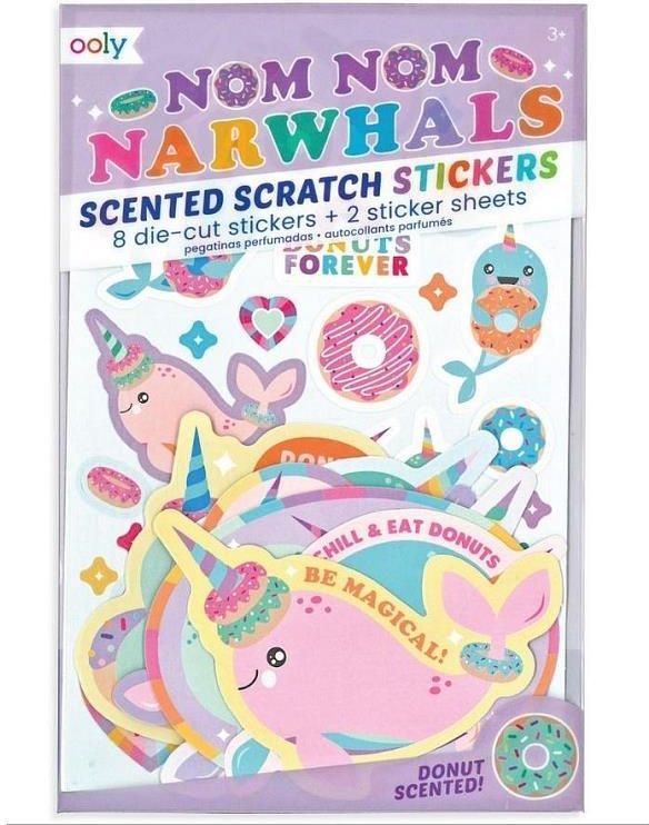 Dzieci uwielbiają kolorowe naklejki. Z upodobaniem ozdabiają nimi zeszyty, notesy, własne rysunki i wszystko na czym da się je przykleić. To doskonały sposób na spersonalizowanie i uatrakcyjnienie nie tylko notatek, ale także życzeń na okolicznościowych kartach, zaproszeń, listów a nawet list zakupów. Wystarczy znaleźć ulubiony wzór. Narwale Nom Nom są prawie jak jednorożce. Równie magiczne i sympatyczne. A przy okazji dość apetyczne, gdyż pachną pączkami! Wystarczy potrzeć palcem, zamknąć oczy i nawet dorosły poczuje się jak małe dziecko w krainie smakowitości. Pachnące naklejki są świetnym uzupełnieniem wyprawki do przedszkola i szkoły nie dość, że estetyczne, przyjemne dla zmysłu powonienia to jeszcze inspirują do kreatywnego ich wykorzystania. Zestaw pachnących naklejek Ooly Narwal: 8 dużych naklejek typu die-cut 2 arkusze małych naklejek 13,97 x 21,59 cm; naklejki pachną pączkami; zapewniają świetną kreatywną zabawę; wiek: 3+