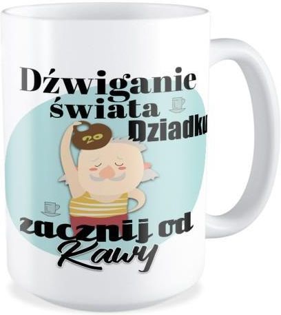 Kubek dźwiganie świata dziadku zacznij od kawy Uwaga, GRATIS! Każdy kubek umieszczany jest w ozdobnym kartoniku! Materiał: CeramikaPowłoka: wielowarstwowa, utwardzanaPojemność: 450 mlWysokość: 116 mmNadruk: Pełnokolorowy, niewyczuwalny w dotykuGrafika: max. 200 - 90 mmNadruk odporny na mycie w …