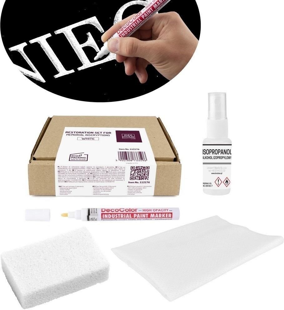 Jak odświeżyć wyblakły napis na płycie granitowej? Zestaw LEVIATAN, pomoże przywrócić pierwotny wygląd inskrypcjom na pomniku. Litery wyżłobione w kamieniu i malowane napisy na nagrobkach z czasem blakną i łuszczą się. Z zestawem LEVIATAN możesz samodzielnie przemalować i odświeżyć napis na polerowanych materiałach. W komplecie znajduje się pumeks szlifierski, marker olejowy w kolorze złotym, płyn odtłuszczający, ściereczka oraz instrukcja użytkowania. - 1szt pumeks biały szlifierski - 1szt marker olejowy biały - 1szt płyn odtłuszczający - 1szt ściereczka- instrukcja renowacji napisów