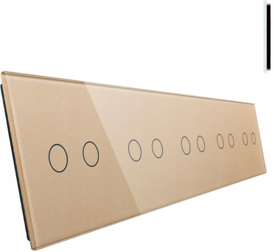 Panel dotykowy dziesięciokrotny, montowany do pięciu puszek w kolorze ZŁOTYM. Dostępne na tej aukcji modele: LIVOLO 7022222-63 (ZŁOTY) Ostatnia litera w tytule aukcji oznacza kolor np: B - BIAŁY. Panel dotykowy na pięć modułów, do dziesięciokrotnych włączników dotykowych LIVOLO, wykonany z krystalicznego szkła hartowanego. Do panelu pasują wszystkie wkłady włączników podwójnych. Wszelkie wkłady dostępne na innych naszych aukcjach. Włączniki i panele można montować zarówno w poziomie, pionie jak i z odwróconym układem pól dotykowych (obrócone o 180 stopni). Należy pamiętać o odpowiednim zmontowaniu wkładów w puszkach (skierowanie wypustu na blaszce montażowej). Standardowy układ pól dotykowych dla tego panelu, przewidziany przez producenta to - 2+2+2+2+2. W celu zakupu kompletnego włącznika lub gniazda zapraszamy na inne nasze aukcje gdzie możecie Państwo nabyć albo kompletny produkt, albo odpowiedni wkład włącznika lub gniazda do ramki z tej aukcji. Nowoczesne i bardzo modne wzornictwo pasujące do nowoczesnych i ekskluzywnych wnętrz. Front wykonany z hartowanego szkła kryształowego, płaskiej powierzchni niezwykle łatwy do utrzymania w czystości. Instrukcja w języku polskim. Włączniki dotykowe Livolo nadają się do zastosowania w typowej instalacji elektrycznej mieszkania. Włączniki są podświetlane. Kółeczka świecą na niebiesko w pozycji OFF i zmieniają kolor na czerwony w pozycji ON. Specyfikacja produktu Rodzaj: panel dziesięciokrotny Wymiary: 364 mm x 80 mm x 8 mm Kolor: złoty Wyposażenie: 1x panel Liczba przycisków: dziesięć Żywotność: 100 000 włączeń Sterowanie: dotykowe Materiał: szkło kryształowe 4 mm Ilość puszek: 5, nadaje się do montażu w standardowej puszce 5x fi 60, z miejscami na wkręty montażowe. Minimalne obciążenie włącznika dotykowego wynosi 5W lub 5W z użyciem adaptera LED który jest przedmiotem innej aukcji (adapter LED jest wymagany wyłącznie do żarówek LED starszej generacji). Napięcie robocze: prąd zmienny 110 V-250 V/50 Hz-60 Hz Natężenie prądu: 16 A. Środowisko pracy: -30~70°C; wilgotność względna poniżej 95%.