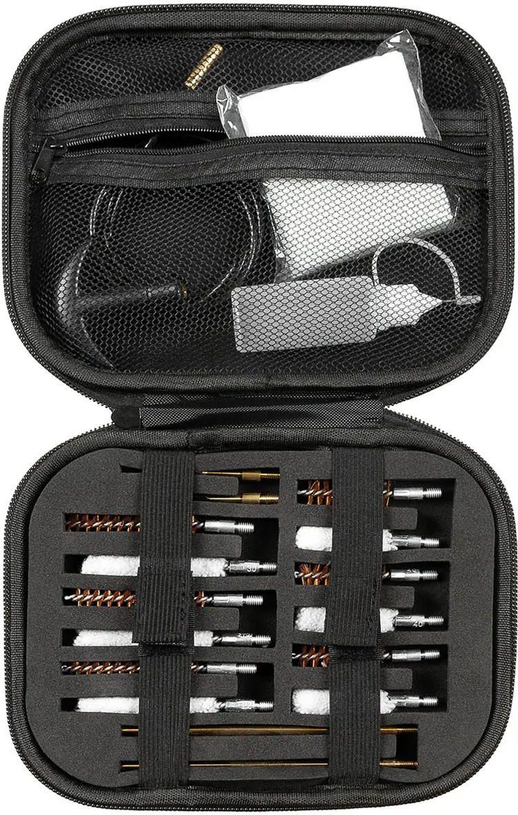 MFH Zestaw do czyszczenia broni krótkiej 19 elementów Czarny MFH Zestaw do czyszczenia broni krótkiej od firmy MFH z końcówkami i szczotkami kompatybilnymi w różnych kalibrach. Dzięki temu użytkownik może go stosować w szerokiej gamie broni począwszy od kalibru .22, kończąc na .45. Podstawowym narzędziem będzie dwuelementowy wycior, który po złożeniu można obsługiwać rączką w kształcie litery T. Na wycior można nakręcić trzy typy końcówek w łącznie sześciu kalibrach - szczotkę z włosiem z brązu, bawełnianą, a także profilowaną końcówkę. Dla tego ostatniego dostępny jest jedynie kaliber .22 oraz .30. Poza tym w zestawie znajduje się nylonowy sznur i butelka na olej z dozownikiem. W przypadku pojawienia się zabrudzenia z zewnątrz można skorzystać z suchych ściereczek znajdujących się domyślnie w wewnętrznej kieszeni. Każda ze szczotek i końcówek ma swoje osobne miejsce wewnątrz etui. Sam pokrowiec jest natomiast zamykany na zamek błyskawiczny. Siatkowana kieszeń może również posłużyć do przenoszenia dodatkowych elementów zgodnie z zapotrzebowaniem użytkownika. Kompaktowe wymiary zestawu pozwolą zmieścić go do każdego plecaka wojskowego lub taktycznego. Cechy Zestaw do czyszczenia broni krótkiej w kalibrze od .22 do .45 Niezbędne narzędzia do konserwacji broni kompaktowym etui Zamykany na zamek błyskawiczny pokrowiec z organizerem i kieszonką Łącznie 19 elementów do dyspozycji użytkownika Umożliwia konserwację broni w warunkach polowych Niska waga i kompaktowe wymiary Dwuelementowy wycior z rączką w kształcie litery T Dedykowane do danego kalibru szczotki z włosiem z brązu i bawełny Nylonowy sznur do czyszczenia Dwie nakładki do przecieraków Suche ściereczki do przecierania splitter Dane techniczneWymiary etui190 x 155 x 50 mmIlość elementów19MateriałPolimerEVAMosiądzBrązBawełnaWaga257 gKolorCzarny Elementy zestawu: Etui na zamek błyskawiczny Szczotka z brązu w kalibrze .22; .27; .30; .38; .40; .45 Miękka szczotka w kalibrze .22; .27; .30; .38; .40; .45 Dwuelementowy wycior Rączka w kształcie litery T Profilowana końcówka w kalibrze .22 i .30 Nylonowy sznur Ściereczki Butelka na olej