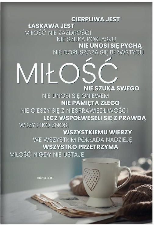 Miłość cierpliwa jest - plakat w białej ramce cały tekst Miłość cierpliwa jest, łaskawa jest. Miłość nie zazdrości, nie szuka poklasku, nie unosi się pychą; nie dopuszcza się bezwstydu, nie szuka swego, nie unosi się gniewem, nie pamięta złego; nie cieszy się z niesprawiedliwości, lecz współweseli …