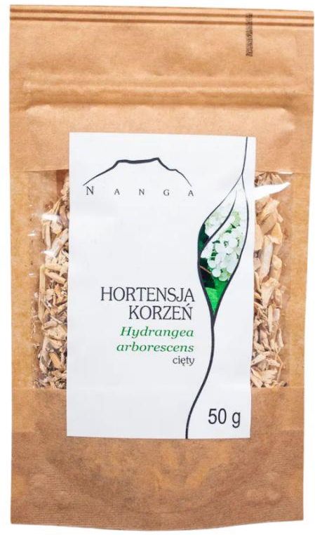 Hortensja krzewiasta (Hydrangea arborescens) – rozłożysty, gęsty krzew o dużych, sercowatych liściach i drobnych kwiatach, zebranych w kuliste kwiatostany. Pochodzi ze wschodnich obszarów Ameryki Północnej. Obecnie ceniony jest w różnych zakątkach świata za swoje walory ozdobne. Surowcem zielarskim jest korzeń hortensji, zawierający takie związki aktywne, jak: flawonoidy (kwercytyna, kemferol), glikozydy, saponiny oraz olejki lotne. Kompozycja tych substancji pozytywnie wpływa na funkcjonowanie układu moczowego oraz wspomaga organizm w oczyszczaniu nerek i dróg moczowych z niekorzystnego osadu. Rdzenni mieszkańcy Ameryki Północnej z plemienia Cherokee dobrze znali właściwości hortensji. Wykorzystywali ją jako środek ułatwiający oddawanie moczu oraz dbający o zdrowie prostaty. Korzeń Hydrangea arborescens wykazuje ponadto działanie antyseptyczne, dzięki któremu wspiera organizm w okresach narażenia na infekcje, szczególnie tych dotyczących układu moczowego. Właściwości prozdrowotne Optymalizuje odpowiedź przeciwzapalną organizmu w obrębie narządów moczowych. Dba o prawidłowe funkcjonowanie prostaty. Działa moczopędnie – wspomaga oczyszczanie z niekorzystnych osadów, obecnych w układzie moczowym. Wspiera organizm w walce z niekorzystnymi drobnoustrojami. Składniki: Korzeń hortensji 100%. Zalecany sposób użycia:Odwar: 1 łyżkę korzeni zalać szklanką wody, doprowadzić do wrzenia i gotować 10-15 minut. Przecedzić. Spożywać 3 razy dziennie po szklance. Sposób przechowywania:Przechowywać w miejscu niedostępnym dla dzieci! Przechowywać w suchym i chłodnym miejscu. Chronić przed bezpośrednim światłem słonecznym. Przeciwwskazania:Nie należy stosować w okresie ciąży i laktacji.