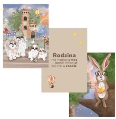 Wyjątkowa kolekcja plakatów z ilustracjami Magdy Pakiet, stworzonymi do serii książek Kawa dla dzieci autorstwa Anny Załęckiej. Ciepłe, pełne uroku grafiki w pastelowych odcieniach wprowadzą do dziecięcego pokoju atmosferę radości i czułości. Do wyboru różne wzory i formaty – każdy plakat drukowany jest na wysokiej jakości papierze 350g, który pięknie oddaje detale ilustracji. Idealny dodatek do pokoju małego miłośnika psów i literatury! Rozmiar A4 Papier kreda mat 350g Uszlachetnienie folią soft touch (miły w dotyku) W zestawie 3 plakaty Zestaw sprzedawany bez ramki Wysokość: 300 Szerokość: 210 Głębokość: 2.000000 Grupa wiekowa: + Isbn: 5907335688024 Rodzaj: Artykuły papiernicze