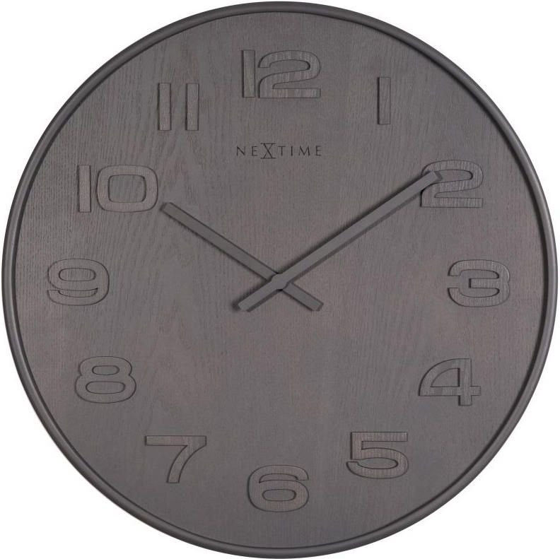 Zegar (szary) Wood Medium Nextime Podstawowe informacje Producent: Nextime Kod produktu: 3096 GS Kolor: szary Materiał: drewno Wymiary: 35 cm (śr.) Pojemność: Zegar ścienny Wood Nextime w kolorze szarym to propozycja do wszystkich minimalistycznych wnętrz. Pasuje do drewnianych dodatków i dobrze prezentuje się praktycznie w każdym wnętrzu - zwłaszcza tym o surowym wystroju. Na prostej tarczy zostały trójwymiarowymi cyframi zaznaczone godziny, a w centrum znajdują się identyczne kolorystycznie wskazówki. Zegar Wood w rozmiarze M wykonany jest z barwionego drewna i wyposażony w skokowy mechanizm kwarcowy zasilany baterią AA.