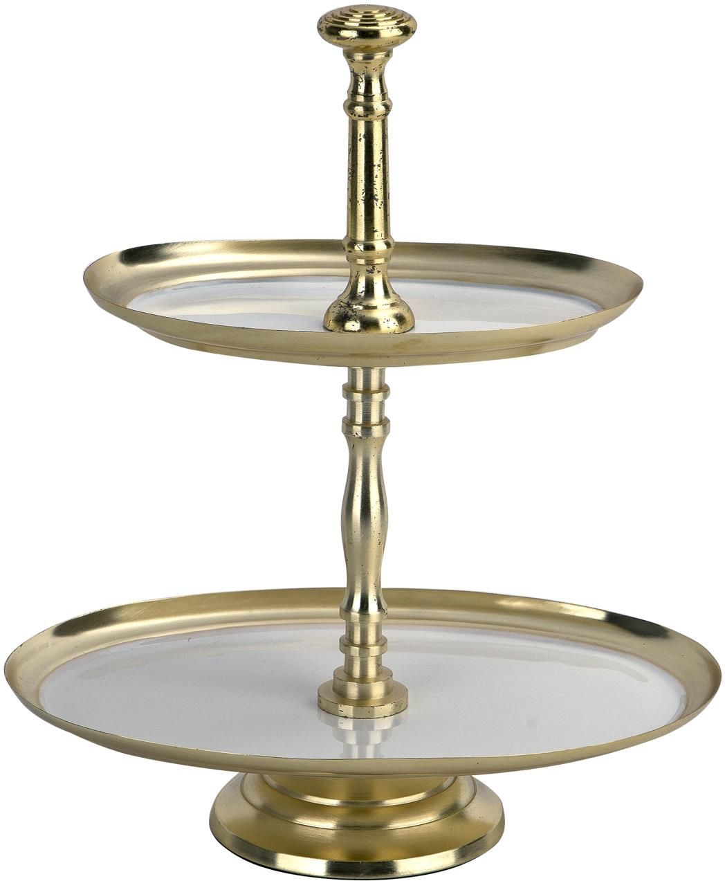 Patera metalowa dwupoziomowa owalna z białym szkliwem 2975 Dwustopniowa patera metalowa w kolorze złota. Posiada dwa owalne talerze, których powierzchnia pokryta jest białym szkliwem. Bardzo praktyczny element wyposażenia domu. Służy przede wszystkim celom dekoracyjnym. Posiada od spodu miękkie podłoże, które zapobiega zarysowaniom na wszelkich powierzchniach. Służy do serwowania ciasta, ciastek i innych wypieków. Dwa poziomy sprawiają, że etażera więcej pomieści nie zajmując jednocześnie miejsca na stole. Metalowa konstrukcja sprawia, że produkt jest odporny na uszkodzenia. Będzie trwały i użyteczny przez długie lata. Szerokość (cm): 18,5 Wysokość (cm): 31 Długość/głębokość (cm): 26,5 Waga (kg): 0,76 Kolor: złoty Można myć w zmywarce: Nie Kształt: Owalny Materiał wykonania: Metal nr katalogowy (328864)