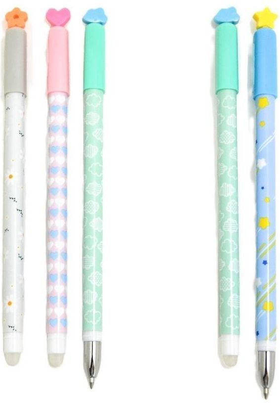 Długopis ścieralny z końcówką kulkową 0,5 mm. Do stosowania zarówno przez najmłodszych jak i starszych użytkowników. Zapisany tekst można w łatwy sposób usunąć poprzez pocieranie silikonową gumką. Możliwość odzyskania tekstu przez schłodzenie. Obudowa w modnych dziecięcych wzorach. Antypoślizgowy uchwyt zwiększający komfort pisania. Zestaw 5 długopisów w cenie 3. Podane w woreczku foliowym.