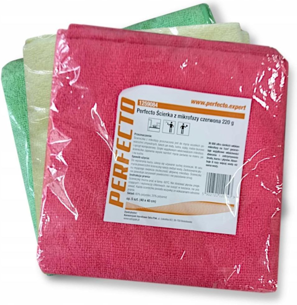 Perfecto Ścierki z mikrofibry Ściereczki idealne dostosowania na sucho lub mokro. Doskonale ścierają kurz i inne zabrudzenia, nie pozostawiając smug. Gwarantuje wyjątkowe właściwości zbierania i zatrzymywania w swojej strukturze brudu, kurzu i płynów. Kolor: czerwony Wymiary: 40x40cm Waga: 36,6g Gramatura: 220 g/m2. Ilość: 5szt SPOSÓB UŻYCIA: Do wycierania kurzu zaleca się używanie suchej ściereczki. W celu umycia powierzchni należy zwilżyć ściereczkę wodą. Zastosowanie płynu myjącego zwiększa skuteczność aktywnej mikrofazy. Ściereczka nie powoduje zarysowań powierzchni i nie pozostawia smug. Temperatura prania: 60°C. Ilość: 5 szt.