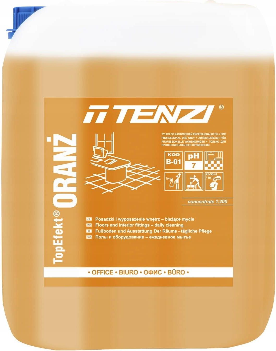 Tenzi TopEfekt ORANŻ Bieżące mycie posadzek i wyposażenia wnętrz Bieżące zmywanie posadzek i wyposażenia wnętrz. Skoncentrowany neutralny preparat o właściwościach myjąco - pielęgnujących i przyjemnym, pomarańczowym zapachu; ze względu na zawartość alkoholi szybko odparowuje i nie pozostawia smug; …