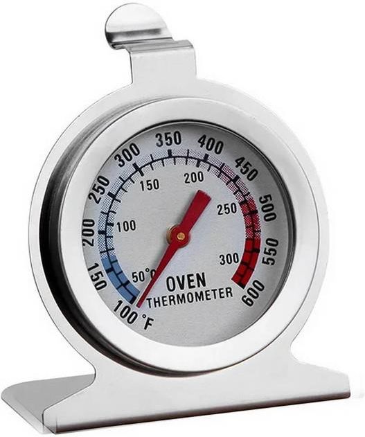 Termometr do piekarnika Cechy produktu: Duży zakres pomiaru temperatury: od 50 do 300 stopni Celsjusza oraz 100 do 600 stopni Fahrenheita Obudowa wykonana ze stali nierdzewnej Duża, czytelna tarcza Do zawieszenia na ruszcie lub postawienia na blacie Wysokość: 7 cm