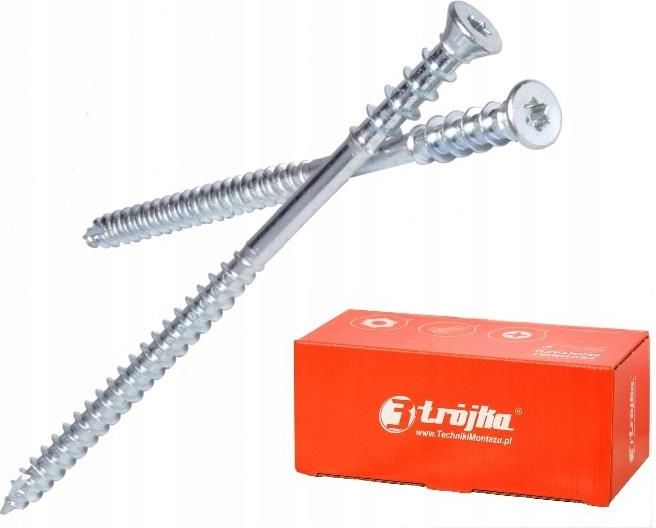 Wkręty dystansowe do poziomowania łat TORX 6x60 100szt Parametry: Średnica zewnętrzna gwintu (dw): 6 mm Średnica wewnętrzna gwintu (d1): 3,9 mm Średnica części gładkiej (ds): 4,3 mm Średnica łba (Dw): 12 mm Długość wkręta (Lw): 60 mm Długość gwintu (lg): 35 mm Max długość użytkowa (tfix): 25 mm Gniazdo: TX25 / TX30 Materiał: stal węglowa, ocynk galwaniczny (grubość warstwy cynku wynosi minimum 5 μm) Reakcja na ogień: Klasa A1 Zastosowanie: Płyty drewnopochodne, listwy, drewniane elementy wykończeniowe, meble, akcesoria meblowe, architektura ogrodowa Ilość: 100 szt. Wkręty dystansowe TRÓJKA stanowią gwarancję pewnego mocowania w we wszystkich rodzajach drewna. Dzięki powłoce woskowej montaż jest szybszy, łatwiejszy i ogranicza zużycie energii co jest szczególnie istotne w narzędziach zasilanych akumulatorem. Wkręty charakteryzuje najwyższa jakość, można je bez obaw stosować w budownictwie. POWŁOKA WOSKOWA Dzięki specjalnej powłoce woskowej nanoszonej podczas procesu produkcji, znacząco zmniejszył się moment wkręcania. Dzięki temu montaż jest szybszy, łatwiejszy i ogranicza zużycie energii co jest szczególnie istotne w narzędziach zasilanych akumulatorem. DUŻY MOMENT SKRĘCAJĄCY Daje możliwość wkręcania wkrętów bez nawiercania nawet w twardych gatunkach drewna. PODWÓJNY GWINT Dodatkowe zwoje na szpicu ułatwiają wkręcanie - umożliwiają „złapanie” drewna przy mniejszej sile docisku. KOŃCÓWKA FREZUJĄCA / KARBY TNĄCE Specjalny kształt końcówki frezującej, to o 20% mniejszy opór podczas wkręcania, który wydłuża czas eksploatacji baterii oraz samych narzędzi. Karby tnące na gwincie przecinają włókna struktury drewna podczas wkręcania. GWINT PODPOROWY Specjalny asymetryczny kształt gwintu pozwala w prosty sposób poziomować mocowany element. WYPUSTKI NACINAJĄCE Zapewniają pełne zagłębienie się łba w elemencie mocowanym - licowanie łba z materiałem. ŁEB STOŻKOWY Z GNIAZDEM TX Zapewnia odpowiednie jego zagłębienie w elemencie mocowanym. Gniazdo TX25 gwarantuje optymalne przeniesienie momentu obrotowego.