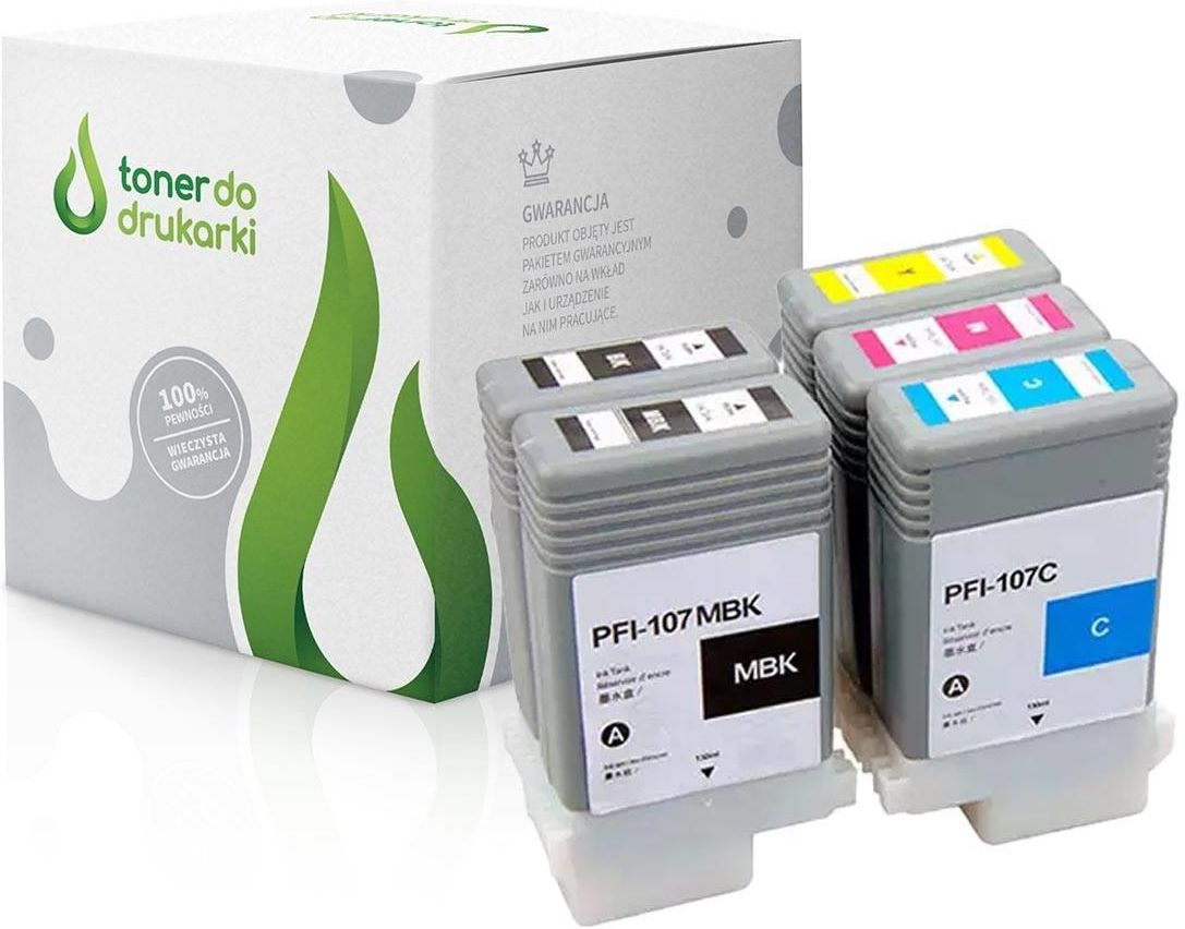 Komplet tuszy do drukarki. Nowy, regenerowany, zamiennik premium. Pięć sztuk w opakowaniu. Wydajność do czarny 130 ml, kolory 130 ml. Oryginalny kod producenta: PFI-107. Zamienniki tuszy do drukarek Canon z serii Print.ink, gwarantują wydajność oraz jakość wydruków identyczną jak w przypadku produktów oryginalnych. Sprawdzą się zarówno w firmie jak i domu, przy wydruku zdjęć, pism, prac domowych, wykresów czy prezentacji. Wyprodukowane i przetestowane zgodnie z normą wydajnościową ISO 24711. Wkłady wypełnione są tuszem zawierającym środek zapobiegający zasychaniu, daje to pewność bezawaryjnej eksploatacji. ## Tusz zamiennik do drukarek Canon kompatybilny z:Canon iPF 670Canon iPF 680Canon iPF 685Canon iPF 770Canon iPF 780Canon iPF 785