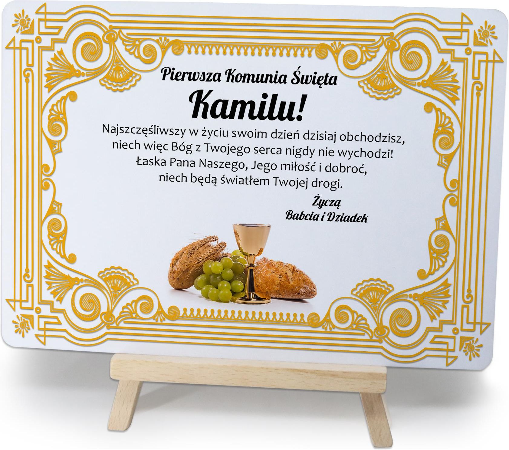 Personalizowana Pamiątka I Komunii Świętej na drewnianej sztaludze Dane techniczne: Rozmiar: 14x10 lub 20x14 cm + wysokość sztalugi Kształt: Prostokąt Grubość: 3mm, Materiał: metal, papier, drewno (sztaluga) Nadruk: pełnokolorowy, niewyczuwalny w dotyku Wyjątkowej urody pamiątka I Komunii Świętej jest naszym autorskim produktem. Pełnokolorowy personalizowany nadruk umieszczany na sztywnym metalowym elemencie idealnie komponuje się z drewnianą sztalugą, na której jest osadzany. Taki zestaw to idealny pomysł na prezent! Sprawdź koniecznie naszą ofertę, na pewno wybierzesz odpowiedni wzór i sprawisz niezapomniany oraz praktyczny prezent bliskiej Ci osobie. A może też znajdziesz coś dla siebie :)