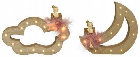 Figurka świąteczna LED z wróżką 25cm dekoracyjna Figurka dekoracyjna w kształcie chmurki lub księżyca idealnie wpasuje się w świąteczny klimat. Stanowi oryginalne uzupełnienie wystroju. Dekoracja nada się jako element kompozycji lub samodzielna ozdoba. Można ustawić ją w dowolnym miejscu w mieszkaniu tak by przykuła uwagę zarówno domowników jak i gości. Wykonana z drewna. Parametry Wysokość: 25 cm Szerokość: 19 cm Materiał wykonania: drewno Kolor dominujący: brązowy Liczba żarówek: 12 Barwa: ciepła Rodzaj baterii: 2xAA (brak w zestawie)