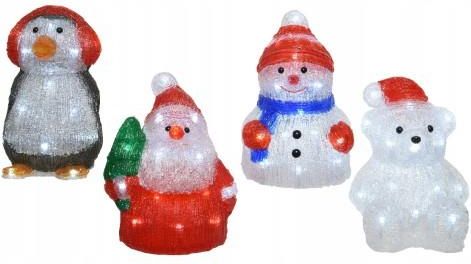 Figurki dekoracyjne LED idealnie wpasują się w świąteczny klimat. Dekoracja nada się jako element kompozycji lub samodzielna ozdoba. Świetnie sprawdzi się jako dekoracja na zewnątrz przykuwając uwagę gości jak również domowników. Produkt występuje w kilku wzorach. Wysyłany losowy wzór dostępny na magazynie. Parametry : Wysokość: 24-25 cm Szerokość: 15-20 cm Materiał wykonania: tworzywo sztuczne Kolor: mix Motyw: bałwan, mikołaj, pingwin, miś Barwa: zimna biała Rodzaj baterii: 3xAA (brak w zestawie) Cena dotyczy 1szt.