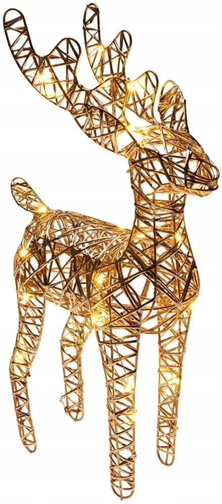 Renifer świecący 37cm (Q4) Świecąca figurka renifera LED 37 cm - Urocza figurka renifera o wysokości 37 cm, wykonana na żelaznej konstrukcji i owinięta taśmą PET w kolorze szampańskiego złota. Podświetlana 30 diodami mikro LED o ciepłej, białej barwie, stanowi elegancką i nastrojową dekorację świąteczną. Ciepłe oświetlenie LED z timerem - Renifer jest podświetlany przez 30 energooszczędnych diod mikro LED, które emitują przyjemne, ciepłe białe światło. Wbudowany programator czasowy (timer) automatycznie włącza oświetlenie na 6 godzin i wyłącza je na kolejne 18 godzin, co zapewnia wygodę użytkowania i oszczędność baterii. Elegancki design w kolorze szampańskiego złota - Figurka ma stylowy kolor szampańskiego złota i minimalistyczną formę, dzięki czemu pasuje do wielu nowoczesnych aranżacji. Jej wymiary 24x8x37 cm sprawiają, że jest idealną ozdobą na komodę, parapet czy biurko. Zasilanie bateryjne - Dekoracja zasilana jest 3 bateriami AA (brak w zestawie), co pozwala na umieszczenie jej w dowolnym miejscu, bez konieczności dostępu do gniazdka. Długi na 30 cm przezroczysty przewód ułatwia dyskretne ukrycie pojemnika na baterie. Do użytku wewnętrznego - Renifer posiada klasę szczelności IP20, co oznacza, że jest przeznaczony do użytku wewnątrz pomieszczeń. Idealnie sprawdzi się jako element świątecznego stroika lub jako samodzielna dekoracja, wprowadzając do domu ciepły nastrój. Świecący renifer w kolorze szampańskiego złota to piękna i nastrojowa dekoracja, która wprowadzi do domu świąteczną magię. Jego subtelne światło i elegancki design doskonale uzupełnią każdą bożonarodzeniową aranżację. Dzięki zasilaniu na baterie i funkcji timera jest to niezwykle wygodna i efektowna ozdoba, która będzie cieszyć oko przez cały okres świąt. Wyprodukowano zgodnie z europejskimi standardami.