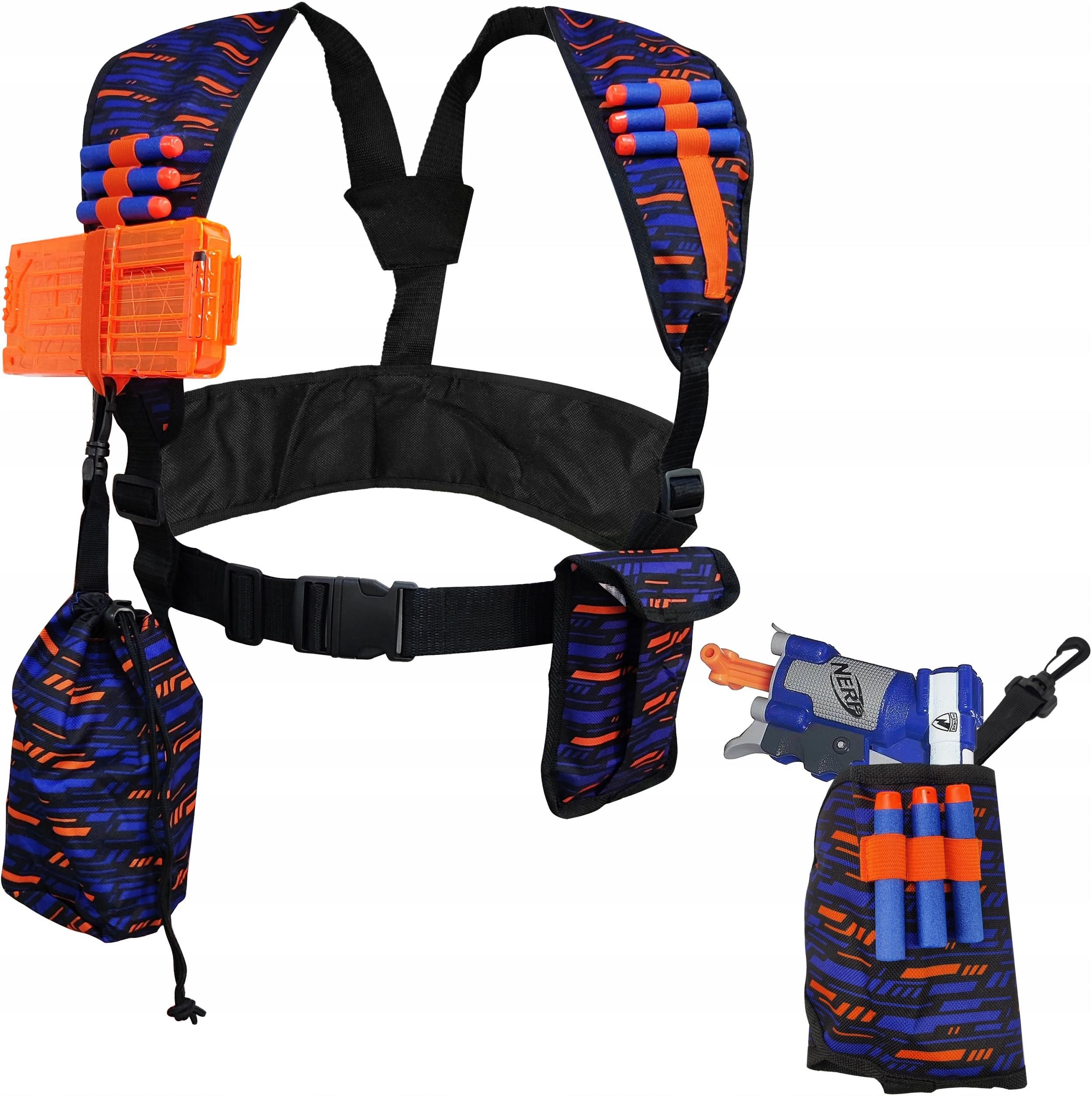 ZESTAW TAKTYCZNY DO NERFA Z SZELKAMIZdobądź przewagę na polu bitwy, dzięki zestawowi taktycznemu do wyrzutni Nerf. Szelki taktyczne o uniwersalnym rozmiarze, pozwalają na zamocowanie dodatkowych akcesoriów takicha jak etui na strzałki, worek czy też dodatkowe magazynki.ZESTAW ZAWIERA:szelki taktyczne (rozmiar uniwersalny)materiałowe etui na 30 strzałekworek na strzałki i magazynekkaburę z karabińczykiem i mocowaniem na udo Kabura na pistoletZakładana na udo lub kamizelkę, niezwykle wygodny sposób na przechowywanie wyrzutni, dzięki kaburze masz ją zawsze pod ręką!Posiada dodatkowe mocowania na 3 strzałki. Etui na strzałkiPraktyczne etui na strzałki, potrafi przechować nawet 30 pocisków, tak byś miał amunicje zawsze pod ręką. Worek na strzałki i akcesoriaPotrzebujesz schować coś więcej? Z dodatkowym workiem na akcesoria nie będzie to problemem. Zmieści aż 75 strzałek i może być wygodnie zamocowany do szelek.
