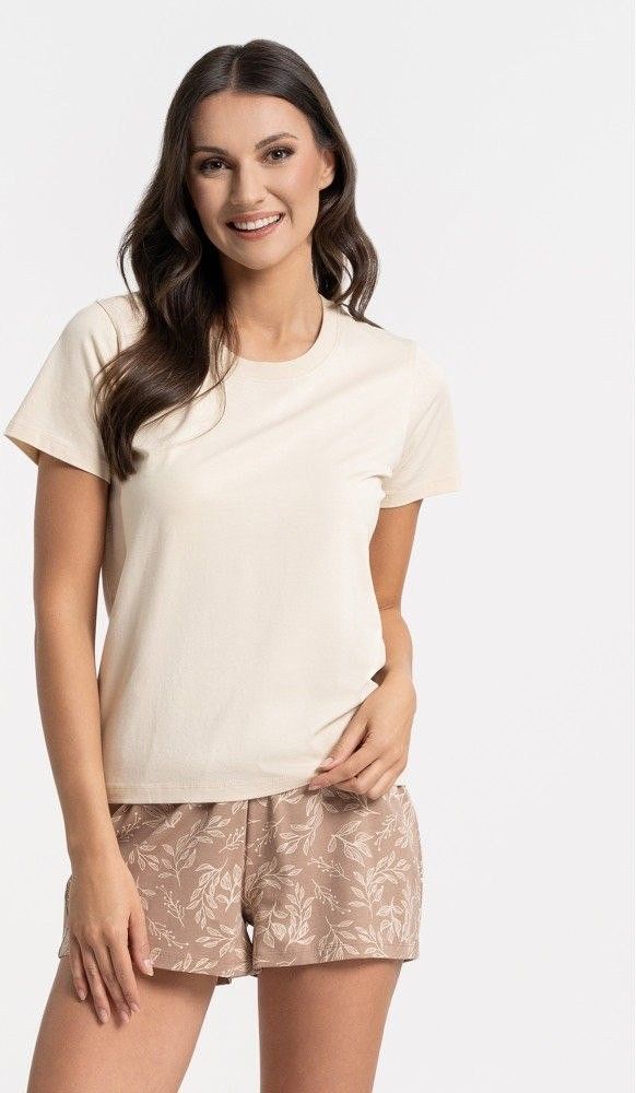 Piżama damska Moraj PDD2800-006 to idealna piżama damska o ponadczasowym kroju i kolorze. Góra piżamy do koszulka z krótki rękawem, jednolita w kolorze jasnego beżu, dekolt obszyty, półokrągły. Spodenki krótkie w kolorze ciemniejszego beżu, wzorowane motywem roślinnym. W pasie szeroka nieuciskająca guma zapewniająca swobodę ruchów w trakcie użytkowania na co dzień. Skład: 95% bawełna 5% elastan