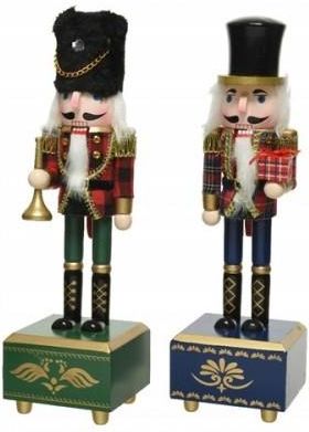 Pozytywka świąteczna dziadek do orzechów Pozytywka świąteczna w kształcie dziadka do orzechów idealnie wpasuje się w świąteczny klimat. Stanowi idealne uzupełnienie wystroju. Dekoracja nada się jako element kompozycji lub samodzielna ozdoba. Ozdoba została wykonana z wysokiej jakości drewna z jodły dzięki czemu jest trwała. Pozytywkę nakręca się od spodu. Idealny pomysł na prezent! Produkt dostępny w dwóch kolorach. Wydawany losowy kolor - dostępny w magazynie. Parametry: Marka: Decoris Kolor dominujący: mix kolorów; zielony, niebieski Materiał wykonania: drewno z jodły, tworzywo sztuczne Wysokość: 30 cm Szerokość: 8 cm Ruchoma żuchwa Nakręcana od spodu Idealny pomysł na prezent!