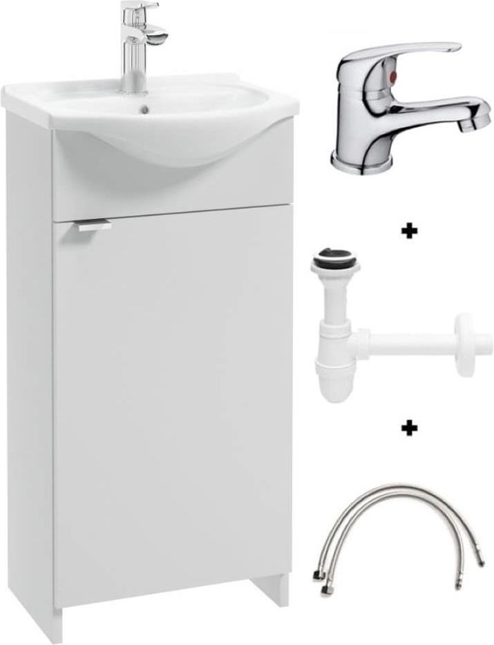 Szafka łazienkowa z umywalka 40, stojąca biały połysk, lakierowany front + akcesoria W skład zestawu wchodzą: ⚪️ umywalka 40 ⚪️ szafka pod umywalkę 40 ⚪️ korek gumowy ⚪️ syfon umywalkowy 50mm ⚪️ bateria jednouchwytowa (długość wylewki około 10 cm) ⚪️ wężyki do baterii 3/8 cala, 34 cm, z uszczelkami Doskonały do małej łazienki zestaw Kredo składający się z szafki z umywalką 40 cm z lakierowanym frontem to funkcjonalny mebel, który optycznie powiększy pomieszczenie i dzięki któremu stworzysz dodatkową przestrzeń. Zestaw Kredo szafka z umywalka 40 cm lakierowany front to świetny wybór, jeśli szukasz czegoś w uniwersalnym kolorze i stylu pasującym do większości płytek i armatury. Zalety produktu: ⚪️ wykonany w kolorze białym z lakierowanym frontem, ⚪️ do samodzielnego montażu w zestawie z niezbędnymi akcesoriami ⚪️ kompletny zestaw gotowy do podłączenia ⚪️ w nowoczesnym, kompaktowym stylu, ⚪️ wygospodarowuje miejsce do przechowywania. ⚪️ idealny do małych łazienek Parametry: ⚪️ Zastosowanie: Meble łazienkowe, mała łazienka ⚪️ Kolor dominujący: Biały ⚪️ Wysokość szafki (cm): 80 cm ⚪️ Wysokość szafki z umywalką: 86 cm ⚪️ Szerokość szafki (cm): 38,2 cm ⚪️ Głębokość szafki: 19,6 cm ⚪️ Szerokość umywalki: 41 cm ⚪️ Głębokość umywalki: 35 cm ⚪️ Sposób montażu: Do samodzielnego montażu ⚪️ Wykonanie umywalki: Ceramika ⚪️ Lakierowane: Tak - fronty ⚪️ Wykonanie korpusu: Płyta wiórowa 16 mm biała ⚪️ Wykonanie frontu: Płyta wiórowa 16 mm lakier biały połysk ⚪️ Waga: 20 kg ⚪️ Kolor Frontu: Biały połysk ⚪️ Kolor Korpusu: Biały ⚪️ Półki: Brak