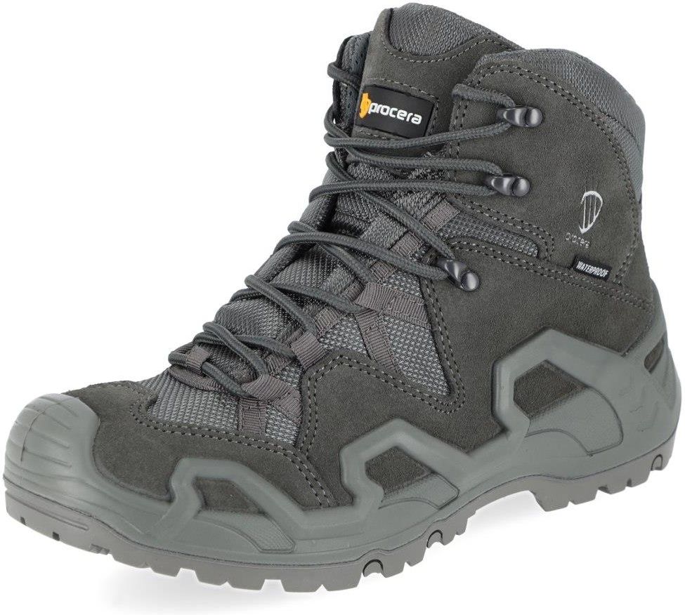 TRZEWIKI EXPLORER GRAY Cechy produktu: Trzewiki Procera Explorer z membraną WATERPROOF są komfortowe i wytrzymałe, idealne do wielu zastosowań. Zaprojektowane do uniwersalnego wykorzystania jako but taktyczny, ale także podczas wszelkich aktywności turystycznych oraz codziennych zajęć. Cholewka wykonana z wysokiej jakości skóry zamszowej zestawionej z tkaniną OXFORD i membraną wodoszczelną, co gwarantuje komfort nawet w trudnych warunkach atmosferycznych. Podeszwa poliuretanowo-gumowa zapewnia pewny krok na każdej nawierzchni, a system amortyzacji EVA pod piętą pozwala na długi czas komfortowego użytkowania. Wysokie, gumowe osłony pięty i czubka buta chronią przed uderzeniami i uszkodzeniami, zwiększając bezpieczeństwo. Miechowy język zapobiega wpadaniu piasku i żwiru, co zwiększa komfort noszenia w różnych warunkach terenowych. Rozmiary dostępne od 39 do 47, co umożliwia dopasowanie do indywidualnych potrzeb użytkowników. Marka: Procera