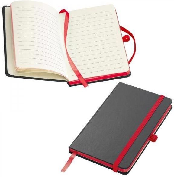 Kolorowy i elegancki notes z czarną okładką z laminatu PVC, zawiera 160 stron w linie. Swój wyjątkowy wygląd zawdzięcza kolorowym brzegom kartek, specjalnej gumce na długopis z boku oraz zakładce z tasiemki. Logotyp można umieścić na okładce.