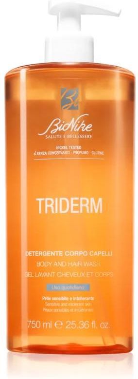 BioNike Triderm, 750 ml, szampon i żel pod prysznic 2 w 1 dla kobiet, Każdy praktyczny mężczyzna, który nie lubi mieć przepełnionej kosmetyczki, doceni żel pod prysznic 2w1 BioNike Triderm . Ponieważ pełni również funkcję szamponu, usuwa wszelkie zanieczyszczenia nie tylko z ciała, ale także z włosów. Jego bogata piana myje skórę nie wysuszając jej, za to otulając ją odświeżającym zapachem, który zostaje na ciele jeszcze przez długi czas. Ten żel pod prysznic do ciała i włosów dzięki swojej wszechstronności stanie się niezbędnym elementem Twojej codziennej higieny. Właściwości: zmiękcza skórę dokładnie myje włosy, nie podrażniając skóry głowy pozostawia skórę przyjemnie świeżą Sposób użycia: Nanieś na wilgotne włosy i skórę całego ciała, lekko spień, rozmasuj, a potem dokładnie zmyj.