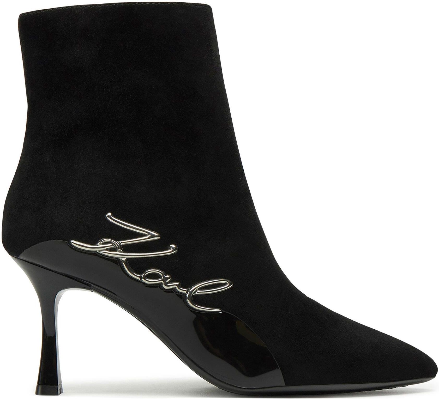 Podkreśl swoją elegancję dzięki damskim botkom od prestiżowej marki KARL LAGERFELD! Wykonane z zamszu, zachwycają wyjątkowym stylem i szykiem. Subtelna szpilka dodaje im wyrafinowanego charakteru, a szpiczasty nosek optycznie wydłuża sylwetkę, podkreślając Twoją kobiecość. Dzięki zapięciu na suwak zakładanie tych botków jest szybkie i wygodne. To idealny wybór dla kobiet, które cenią sobie luksus i niepowtarzalny design w codziennych stylizacjach. Wyraź swoją wyjątkowość z botkami KARL LAGERFELD!