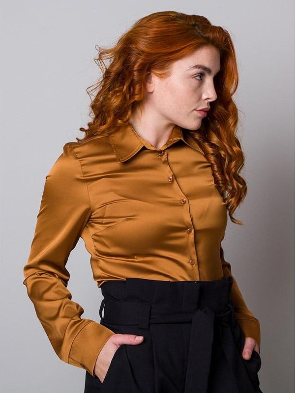 Brązowa bluzka damska o prostym kroju i gładkiej fakturze z miękkim kołnierzykiem, tkanina imitująca satynę