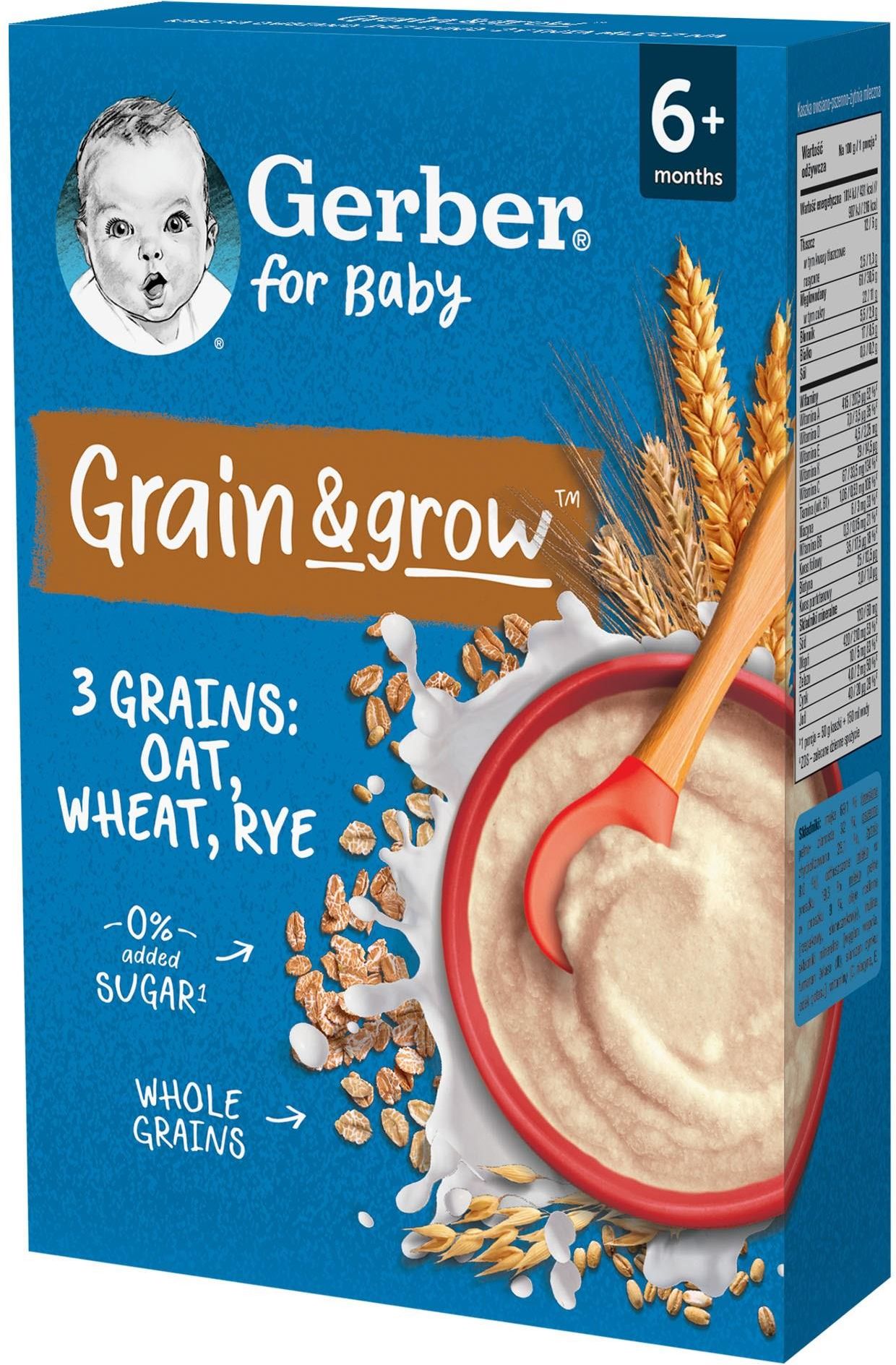 Kaszka owsiano-pszenno-żytnia mleczna Jeśli Twój maluch właśnie skończył 6 miesięcy, to może być dobry moment, aby wprowadzić do jego diety kaszkę owsiano-pszenno-żytnią mleczną. Ta wyjątkowa kompozycja składająca się z owsa, pszenicy i żyta została stworzona z myślą o potrzebach dzieci powyżej 6 miesiąca życia. Kaszka z linii Gerber Grain and Grow to prawdziwa skarbnica składników odżywczych niezbędnych maluszkowi do radosnego odkrywania świata każdego dnia. Zawiera ona pełnoziarniste zboża, mleko, witaminy oraz składniki mineralne. Odkryj zalety produktu Kaszki Gerber Grain & grow zawierają nie tylko to, co niezbędne, ale znacznie więcej! To dobro wysokiej jakości zbóż, w tym pełnoziarnistych, dopasowanych do potrzeb żywieniowych Twojego Maluszka.  Kaszka owsiano-pszenno-żytnia mleczna została stworzona z myślą o najmłodszych po 6. miesiącu życia. Łączy w sobie trzy wartościowe zboża: owies, pszenicę i żyto. Produkt nie zawiera cukru¹, a dla dobra maluszków wzbogacony jest w witaminy i składniki mineralne. W jej składzie znajdziesz żelazo, które jest kluczowe dla prawidłowego rozwoju funkcji poznawczych dziecka oraz cynk, który wspiera jego zdrowy wzrost. Dodatkowo wapń i witamina D przyczyniają się do prawidłowego rozwoju kości, a cynk oraz witamina C wzmacnia układ odpornościowy. Kaszki z linii Grain & grow to dobra propozycja na wprowadzenie glutenu do diety maluszka i urozmaicenie jego posiłków dzięki różnorodnym zbożom. ¹ Zawiera naturalnie występujące cukry. Tabela wartości odżywczych i składniki produktu Składniki mąka 69,1% (owsiana pełnoziarnista 32%, pszenna zhydrolizowana 29,1%, żytnia 8,0%), odtłuszczone mleko  w proszku 19,3%, mleko pełne w proszku 9%, oleje roślinne (rzepakowy, słonecznikowy), inulina, składniki mineralne [węglan wapnia, fumuran żelaza (II), siarczan cynku, jodek potasu], witaminy (C, niacyna, E, B1, kwas pantotenowy,  A, B6, K, kwas foliowy, biotyna, D).  Gramatura Masa netto: 200 g Segregując odpady, dbasz o lepszą przyszłość Twojego dziecka. Kartonik wyrzuć do kosza oznaczonego kolorem niebieskim, natomiast torebkę do kosza oznaczonego kolorem żółtym.  Sposób przygotowania Zanim przystąpisz do przyrządzania posiłku, umyj dokładnie ręce i upewnij się, czy naczynia, których będziesz używać, są czyste.  Zagotuj wodę i odmierz 150 ml, wlej do miseczki i ostudź do ok. 40°C.  Dodaj 50 g (około 6-7 łyżek stołowych) kaszki. Używaj czystej i suchej łyżki.  Mieszaj do uzyskania jednolitej konsystencji.  Nakarm dziecko, używając czystej łyżeczki.  Przestrzegaj instrukcji właściwego przygotowania. Opakowanie zawiera około 4 porcji. Wielkość porcji powinna być dostosowana do wieku dziecka.  Sposób podawania Nie przechowuj resztek posiłku. Nieprawidłowe przygotowanie i przechowywanie może zaszkodzić Twojemu dziecku.  Po każdym użyciu zamknij szczelnie torebkę i przechowuj w suchym i chłodnym miejscu. Po otwarciu zawartość torebki zużyj w ciągu 3 tygodni. Najlepiej spożyć przed końcem: patrz data na spodzie opakowania.  Poznaj wszystkie produkty z linii Gerber Grain & Grow Jeśli Twoje dziecko poznało już Kaszkę mleczną ryżową Banan, możesz zapoznać maluszka także z innymi produktami Gerber!