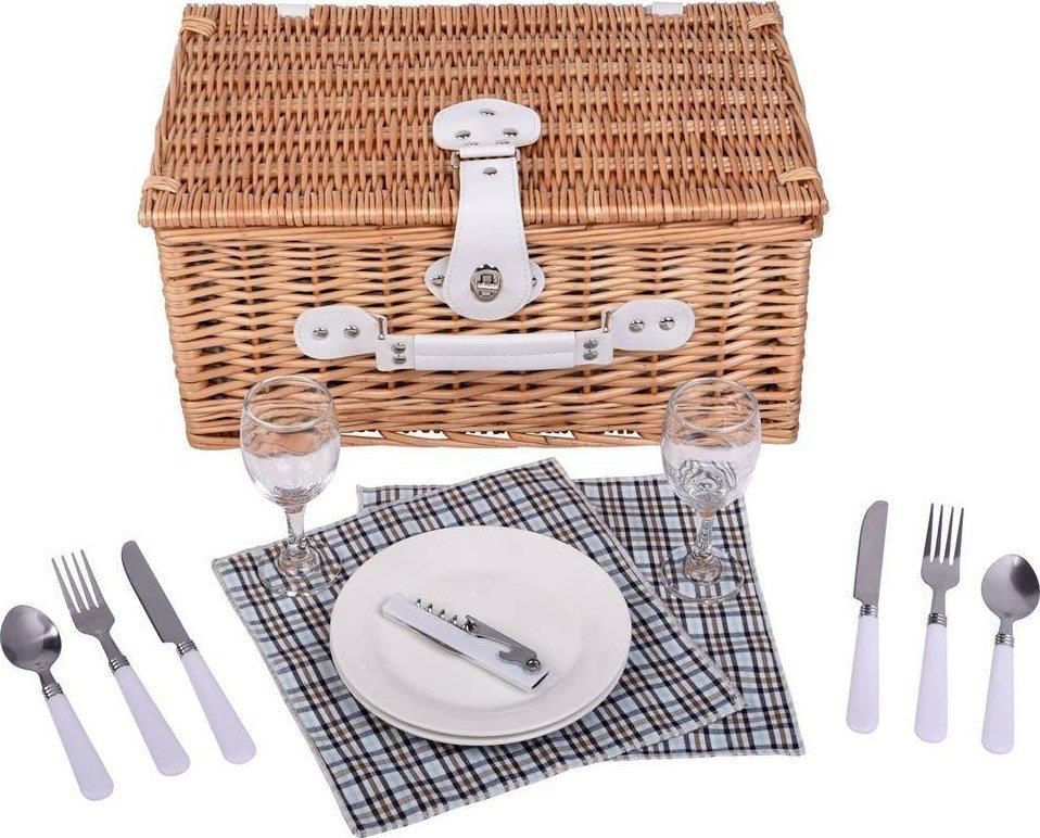 Wiklinowy koszyk piknikowy KINGS PARK, brązowy Kolory: Brązowy Waga: 2.19kg Stan: Nowy Wiklinowy koszyk piknikowy KINGS PARK dla dwóch osób: zawiera sztućce ze stali nierdzewnej z plastikowymi rączkami, ceramiczne talerze, kieliszki na wino, serwetki oraz nóż kelnerski. Kosz z uchwytem i …