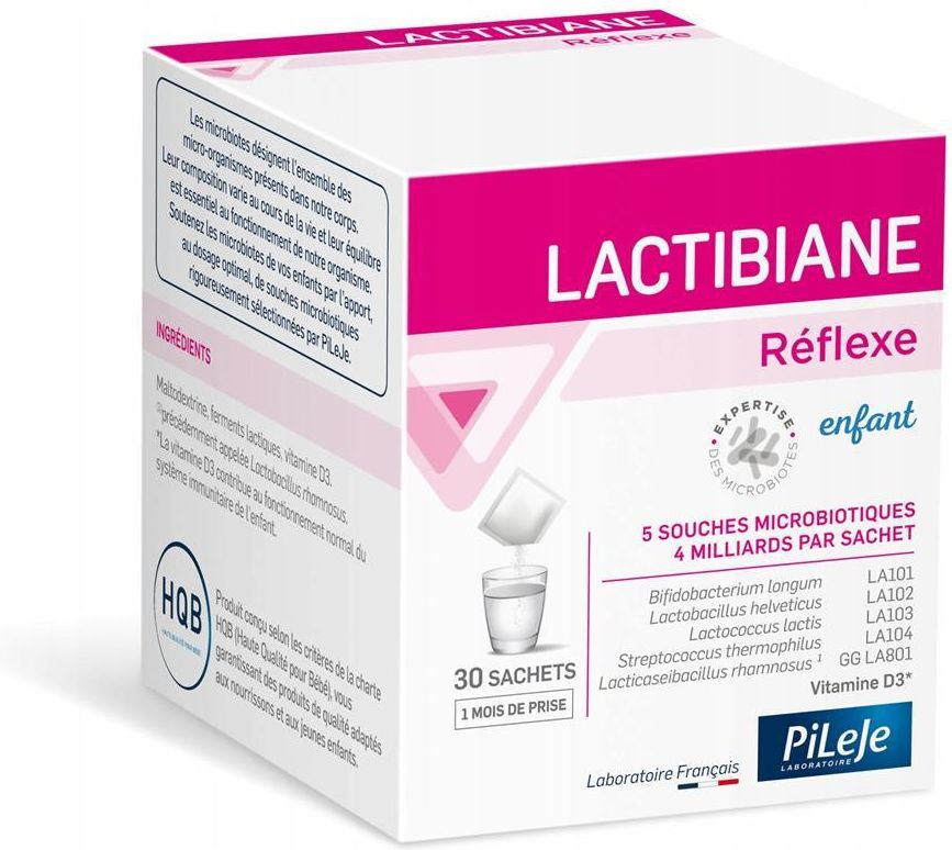 PILEJE Lactibiane Reflexe dla dzieci Odporność wzrost kolki 30 saszetek Suplement diety PILEJE Lactibiane Reflexe dla dzieci 30 saszetek - to probiotyczny suplement diety opracowany specjalnie z myślą o dzieciach od 6. miesiąca życia. Wspiera rozwój mikrobioty jelitowej oraz układ odpornościowy, a także wspomaga prawidłowy wzrost i rozwój kości. Korzyści ze stosowania: Wspiera rozwój zdrowej mikroflory jelitowej u dzieci. Wzmacnia odporność – szczególnie w okresach zwiększonej podatności na infekcje. Pomaga w prawidłowym wzroście i rozwoju kości dzięki witaminie D3. Zalecany przy kolkach, biegunkach, zaparciach, infekcjach żołądkowo-jelitowych. Może wspomagać dzieci z problemami alergicznymi i atopowymi. Bezpieczny dla dzieci od 6. miesiąca życia. Łatwy w użyciu – 1 saszetka dziennie, rozpuszczona w chłodnym lub letnim napoju, najlepiej przed posiłkiem. Skład Mieszanka bakterii kwasu mlekowego (Bifidobacterium longum LA101, Lactobacillus helveticus LA102, Lactococcus lactis LA103, Streptococcus thermophillus LA104, Lactobacillus rhamnosus LA801), substancja wypełniająca: skrobia ziemniaczana, dekstroza, fruktooligosacharydy z cykorii, maltodekstryna, nośnik (celuloza), witamina D. Sposób użycia Niemowlęta od 6 miesiąca życia i dzieci: 1 saszetka na dzień. Proszek należy rozpuścić w szklance wody. Najlepiej podawać przed posiłkiem. Zalecany czas trwania suplementacji: 1 miesiąc, po czym stosowanie można powtórzyć. Ilość netto: 30 saszetek Sposób przechowywania Nie przechowywać w lodówce. Przechowywać w sposób niedostępny dla małych dzieci, w suchym miejscu. Ostrzeżenia Nie należy przekraczać zalecanej dziennej porcji. Produkt przeznaczony dla dzieci od pierwszego dnia życia. Suplement diety nie może być stosowany jako substytut (zamiennik) zróżnicowanej diety. Zrównoważony sposób żywienia i prawidłowy tryb życia jest ważny dla funkcjonowania organizmu człowieka. Tworzenie się osadu na dnie butelki jest normalne. Nie zawiera glutenu ani laktozy. Producent PiLeJe 7. rue des 2 Provinces Saint-Laurent-des-Autels 49270 Ortee d'Anjoe, Francja Podmiot odpowiedzialny Aurora Łukasz Wróbel ul. Podmiejska 95 BH2/112 44-207 Rybnik