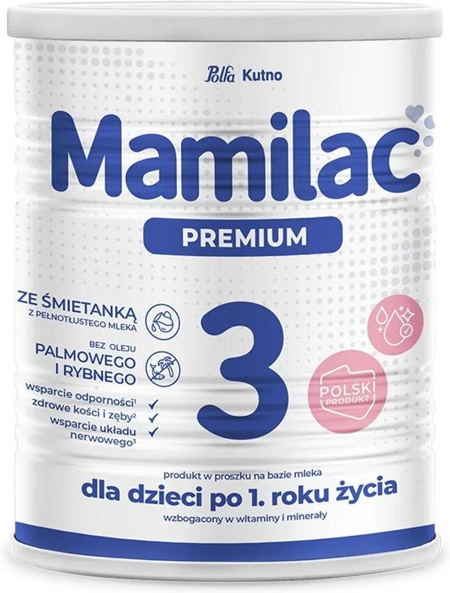 Mamilac Premium 3 powyżej 1. roku 400g TROSKA O ROZWÓJ TWOJEGO MALUSZKA Żywienie niemowlęcia nie powinno oznaczać stresu, wyrzutów sumienia ani nadmiernych kosztów. Jeśli nie możesz karmić piersią, Mamilac daje Ci pewność, że wybierasz smaczne mleko ze śmietanką z pełnotłustego mleka, czysty skład i zdrowy rozwój – wszystko w cenie, na którą możesz sobie pozwolić. DLA DZIECI POWYŻEJ 1. ROKU ŻYCIA ➕ Jedyne mleko modyfikowane ze śmietanką z pełnotłustego mleka, co wpływa na naturalną kompozycję tłuszczów � Zawiera naturalny MFGM (błonę tłuszczową mleka) pochodzący z tłuszczu mlecznego, wspierający rozwój dziecka Bez oleju palmowego, oleju rybnego, syropu glukozowego, maltodekstryny oraz lecytyny sojowej – dla czystszego i bezpieczniejszego składu Skład wzorowany na mleku matki, z odpowiednim stosunkiem białek serwatkowych do kazeinowych oraz obecnością laktozy 🌾 Zawiera prebiotyki GOS i FOS, które wspierają zdrową mikroflorę jelitową i prawidłowe trawienie Wyprodukowane w Polsce przez polską firmę rodzinną – z dbałością o jakość i tradycję Mamilac Premium to mleko modyfikowane stworzone z myślą o kompleksowym wsparciu prawidłowego rozwoju niemowląt już od pierwszych dni życia. Jego starannie opracowana receptura opiera się na wysokiej jakości składnikach, które wspierają wzrost, rozwój układu odpornościowego oraz funkcje poznawcze dziecka. Posiada dodatek śmietanki z pełnotłustego mleka, który wzbogaca profil tłuszczowy produktu o tłuszcze mleczne, Zawiera prebiotyk GOS, który wspiera zdrową florę bakteryjną jelit, co jest istotne dla prawidłowego trawienia i wchłaniania składników odżywczych, Dostarcza wszystkich niezbędnych witamin i minerałów potrzebnych do prawidłowego wzrostu i rozwoju niemowląt, w tym wapnia i witaminy D, kluczowych dla rozwoju kości, Odpowiednio zbilansowany skład białek (serwatkowych i kazeinowych) oraz tłuszczów sprawia, że mleko jest łagodne dla układu trawiennego i dobrze przyswajalne, Zawiera DHA, taurynę i nukleotydy, które wspierają rozwój mózgu, wzroku oraz prawidłowe funkcjonowanie organizmu, Każda partia mleka Mamilac jest szczegółowo badana laboratoryjnie, a proces produkcji podlega stałemu nadzorowi, co gwarantuje najwyższe standardy jakości i bezpieczeństwa dla Twojego dziecka. Mamilac Premium to polski produkt, opracowany przez ekspertów w dziedzinie żywienia niemowląt, który stanowi wartościową alternatywę dla dzieci, które nie mogą być karmione piersią lub wymagają uzupełnienia diety. Dzięki minimalnie przetworzonej formule oraz zastosowaniu nowoczesnych technologii produkcji, mleko to jest łagodne dla delikatnego układu pokarmowego niemowląt i wspiera ich harmonijny rozwój. Skład mleka MAMILAC Skład mleka Mamilac – co zawiera? ➕ Witaminy i minerały niezbędne do prawidłowego wzrostu i rozwoju niemowląt Prebiotyki GOS i FOS – wspierają rozwój zdrowej mikroflory jelitowej oraz prawidłowe trawienie DHA pochodzenia roślinnego – kwas tłuszczowy omega-3 wspierający rozwój mózgu i wzroku Cholesterol i fosfolipidy – naturalne składniki tłuszczów mleka, ważne dla budowy komórek i układu nerwowego ?️ Dodatkowe immunoskładniki: cynk, żelazo i witamina D, które wspierają prawidłowe funkcjonowanie układu odpornościowego Czego nie ma w mleku Mamilac? 🚫 Bez oleju palmowego 🚫 Bez oleju rybiego 🚫 Bez maltodekstryny i syropu glukozowego 🚫 Bez lecytyny sojowej 🚫 Bez glutenu 🚫 Bez GMO 🚫 Bez chloranów i nadchloranów 🚫 Bez antybiotyków 🚫 Bez metali ciężkich i dioksyn Składniki: laktoza (z mleka), śmietana (z mleka), serwatka demineralizowana (z mleka), mleko odtłuszczone, olej słonecznikowy, galaktooligosacharydy (GOS, z mleka), olej rzepakowy o niskiej zawartości kwasu erukowego, olej kokosowy, fruktooligosacharydy (FOS), węglan wapnia, chlorek sodu, olej z mikroalg Schizochytrium sp., sole wapniowe kwasu ortofosforowego, chlorek potasu, sole magnezowe kwasu cytrynowego, chlorek choliny, L-askorbinian sodu, kwas L-askorbinowy, olej z Mortierella alpina, tauryna, siarczan żelaza(II), nukleotydy (kwas cytydyno-5'-monofosforowy, sole sodowe kwasu urydyno-5'-monofosforowego, kwas adenozyno-5'-fosforowy, sole sodowe kwasu guanozyno-5'-fosforowego, sole sodowe kwasu inozyno-5'-fosforowego), diwinian choliny, wodorotlenek wapnia, tlenek magnezu, siarczan cynku, nikotynamid, octan DL-alfa-tokoferylu, 6-palmitynian-L-askorbylu, D-pantotenian wapnia, siarczan miedzi(II), chlorowodorek tiaminy, chlorowodorek pirydoksyny, octan retinylu, ryboflawina, kwas foliowy, jodek potasu, selenian(VI) sodu, fitomenadion, D-biotyna, cholekalcyferol, cyjanokobalamina. MARKA MAMILAC Mamilac to polska marka mleka modyfikowanego dla niemowląt, produkowana przez rodzinną firmę Geo-Poland z siedzibą w Poznaniu. Historia firmy sięga 1992 roku, a sama produkcja mleka Mamilac rozpoczęła się w 2005 roku w nowoczesnych zakładach w Kutnie – miejscu z tradycjami farmaceutycznymi sięgającymi 1935 roku. Obejrzyj proces produkcyjny mleka Mamilac na filmie. Dzięki wieloletniemu doświadczeniu oraz zaangażowaniu ekspertów, Mamilac stał się największym polskim producentem mleka dla niemowląt. Każdego roku w zakładach w Kutnie powstaje ponad 4 miliony puszek mleka, które trafiają do dzieci w ponad 20 krajach na całym świecie – głównie w Europie, Afryce i Azji. Mamilac to wybór rodziców, którzy cenią bezpieczeństwo, jakość i polskie pochodzenie produktów dla swoich dzieci. Sięgnij po produkt, który łączy polskie pochodzenie i tradycję z nowoczesnym zapleczem naukowym oraz doświadczeniem w żywieniu najmłodszych. Mamilac 3 Premium to formuła opracowana z myślą o potrzebach aktywnych, ciekawych świata dzieci po ukończeniu 1. roku życia. PRODUCENT I CERTYFIKATY Producentem mleka Mamilac jest polska firma rodzinna Geo-Poland z siedzibą w Poznani