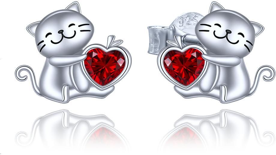 Minet Kolczyki srebrne kotki z serduszkiem i czerwonymi cyrkoniami Skarszewy
