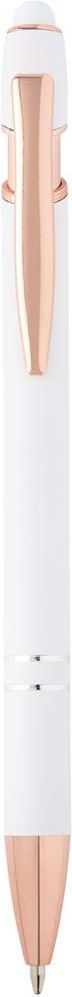 Długopis Nanna z wykończeniem w kolorze różowego złota ma korpus wykonany z aluminium z recyklingu i rysik dotykowy wykonany z silikonu. Aluminium z recyklingu ogranicza ilość odpadów na wysypiskach śmieci i pomaga chronić zasoby naturalne w celu zmniejszenia emisji gazów cieplarnianych. Kolor tuszu: Niebieski. Żywotność: 800 metrów. Rozmiar stalówki: 1,0 mm.