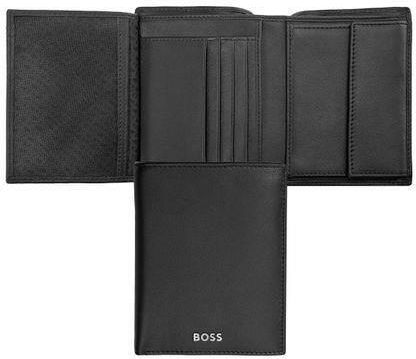 Ten pionowy portfel z klapką i kieszenią na monety jest wykonany ze starannie dobranej, czarnej, gładkiej skóry. Jest ozdobiony luksusową chromowaną tabliczką z podpisem BOSS i posiada wewnętrzną podszewkę z monogramem. Portfel zawiera: 2 przegrody na waluty 8 miejsc na karty 5 przegródek bocznych 1 miejsce na monety Zgodnie z DNA marki BOSS, jest prosty, funkcjonalny, elegancki i minimalistyczny.