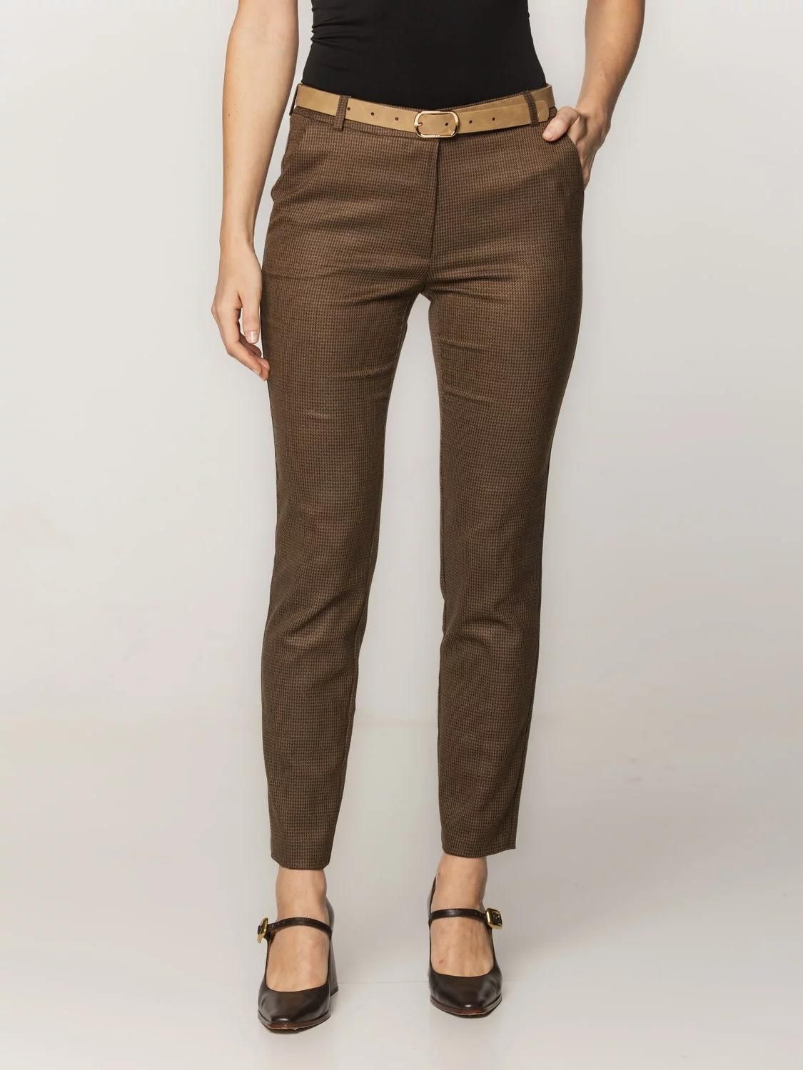 Klasyczne spodnie garniturowe Wybierając spodnie garniturowe marki Willsoor bez wątpienia przekonasz się do noszenia ich nie tylko od święta, ale również na co dzień! Spodnie zostały uszyte z delikatnej, miękkiej i elastycznej tkaniny podkreślającej sylwetkę, dzięki czemu nawet nie poczujesz, że masz na sobie tak niebywale elegancki strój. Zwężane nogawki posiadają zaprasowane kanty. W pasie znajdują się szlufki oraz ukryty guzik, a z tyłu imitowane kieszenie z wypustkami. Tkanina: 33% wiskoza, 64% poliester, 3% elastan Kolor główny: brązowe w pepitkę Nogawki: zwężane Kieszenie: dwie boczne Producent: Willsoor Gwarancja: 24 m-ce Uszyte w Polsce