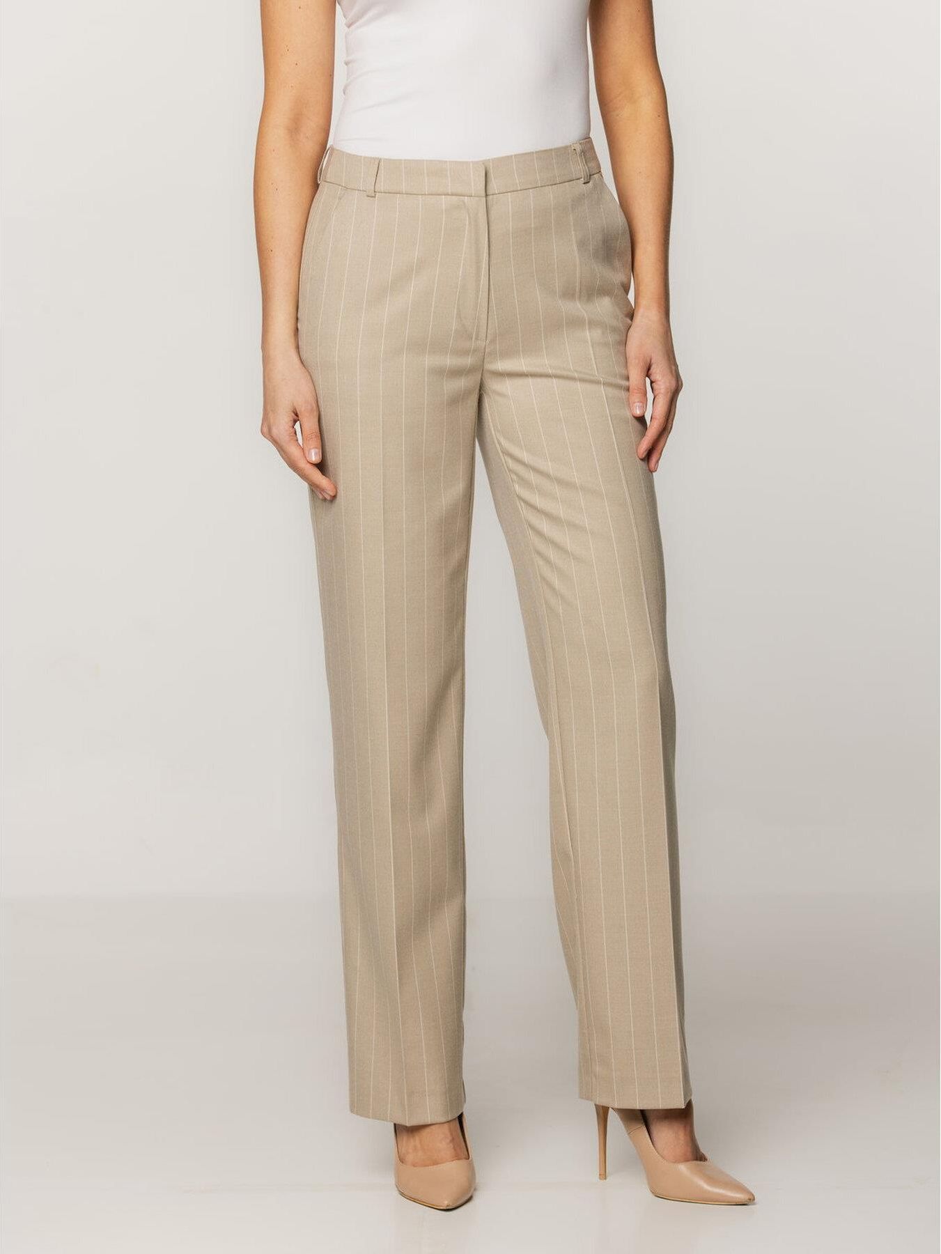 Klasyczne, beżowe spodnie garniturowe w białe prążki o prostym fasonie z zaprasowanymi kantami