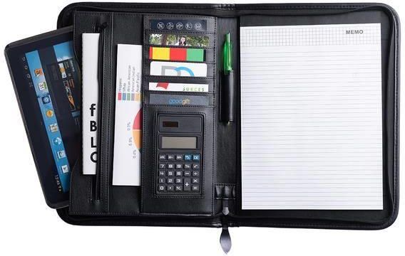 Wykonana z ekoskóry czarna teczka konferencyjna A4 z kalkulatorem, zapinana na zamek. Posiada aż 6 kieszonek, przegródki na dokumenty, uchwyt na długopis i kieszeń z zamkiem. Praktyczna teczka biznesowa wyposażona we wkład papierowy A4. Kalkulator zasilany 1 baterią AG10 dołączoną do produktu. Może pomieścić 20 wizytówek. Wyposażenie nie jest dołączone.