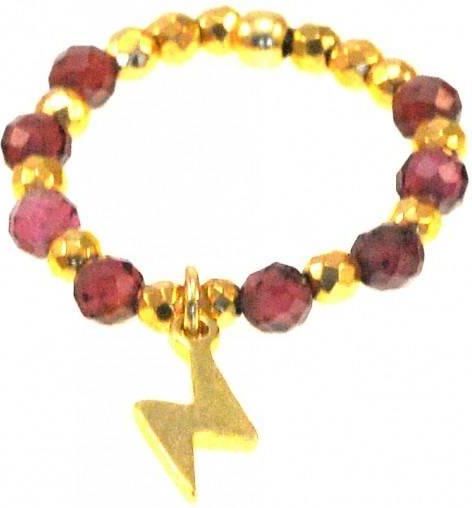 Kamień: Granat+ Hematyt + srebrny element, pozłacane 24 karatowym żółtym złotem Pierścionek wykonany na bardzo wytrzymałej gumce, odpornej na uszkodzenia. Rozmiar kamienia: 2/3 mm Rozmiar uniwersalny. Produkt wykonywany ręcznie