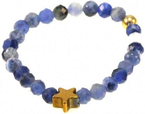 Kamień: Sodalit+ Hematyt + srebrny element, pozłacane 24 karatowym żółtym złotem Pierścionek wykonany na bardzo wytrzymałej gumce, odpornej na uszkodzenia. Rozmiar kamienia: 2 mm Rozmiar uniwersalny. Produkt wykonywany ręcznie