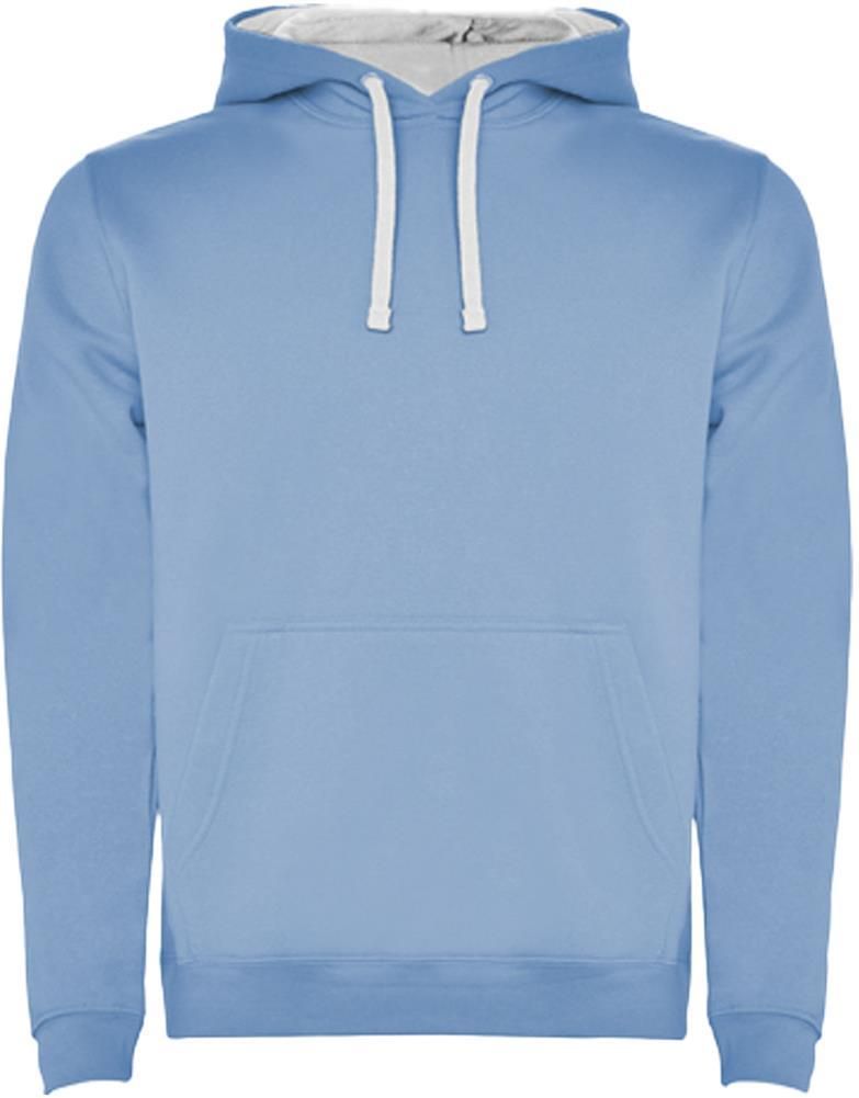 Dwukolorowa bluza z kapturem z podwójnego materiału, kontrastowym regulowanym sznurkiem, wzmocnionymi krytymi szwami w kołnierzu i kieszenią typu kangurka. Ściągacze 1x1 z elastanu w mankietach i pasie. Usuwalna metka.