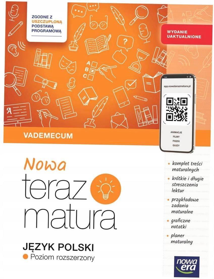 Nowa Teraz matura 2026. Jezyk polski. Vademecum. Zakres rozszerzony 2025/20 Sprawdzone vademecum, które łączy wiedzę, zadania, praktykę egzaminacyjną i wsparcie cyfrowe. To publikacja, która odpowiada na nowe wymagania i realne potrzeby maturzystów – zgodna z uszczuploną podstawą programową, w uaktualnionej wersjiCo znajdziesz w środku?Wszystko, co musisz wiedzieć o maturze pisemnej z języka polskiego:• uaktualnione informacje na temat budowy arkuszy maturalnych w działach Matura pisemna – poziom podstawowy i Matura pisemna – poziom rozszerzony• zmiany w przykładowym teście historycznoliterackim i wypracowaniachRzetelna powtórka z lektur:• opracowane wszystkie lektury i zagadnienia wymagane na egzaminie maturalnym na poziomie podstawowym oraz na poziomie rozszerzonym zgodne z uszczuploną podstawą programową,• lektury oraz zagadnienia wymagane na poziomie rozszerzonym oznaczone literą R,• opracowane konteksty i mapy myśli.Skuteczne przygotowanie i samodzielna nauka:• zadania maturalne po każdym dziale, wyposażone we wskazówki oraz odpowiedzi i przykładowe realizacje (konspekty),• tematy wypracowań maturalnych na poziomie rozszerzonym ze wskazówkami oraz przykładowymi realizacjami (konspektami),• graficzne notatki do uzupełniania – porządkują materiał i wspierają zapamiętywanie,• planer – plan przygotowań do matury.Dostęp do materiałów cyfrowych:• quizy i animacje do lektur, fiszki i filmy utrwalające wiedzę o epokach,• krótkie streszczenia lektur w vademecum oraz szczegółowe streszczenia w aplikacji. Sprawdzone vademecum, które łączy wiedzę, zadania, praktykę egzaminacyjną i wsparcie cyfrowe. To publikacja, która odpowiada na nowe wymagania i realne potrzeby maturzystów – zgodna z uszczuploną podstawą programową, w uaktualnionej wersjiCo znajdziesz w środku?Wszystko, co musisz wiedzieć o maturze pisemnej z języka polskiego:• uaktualnione informacje na temat budowy arkuszy maturalnych w działach Matura pisemna – poziom podstawowy i Matura pisemna – poziom rozszerzony• zmiany w przykładowym teście historycznoliterackim i wypracowaniachRzetelna powtórka z lektur:• opracowane wszystkie lektury i zagadnienia wymagane na egzaminie maturalnym na poziomie podstawowym oraz na poziomie rozszerzonym zgodne z uszczuploną podstawą programową,• lektury oraz zagadnienia wymagane na poziomie rozszerzonym oznaczone literą R,• opracowane konteksty i mapy myśli.Skuteczne przygotowanie i samodzielna nauka:• zadania maturalne po każdym dziale, wyposażone we wskazówki oraz odpowiedzi i przykładowe realizacje (konspekty),• tematy wypracowań maturalnych na poziomie rozszerzonym ze wskazówkami oraz przykładowymi realizacjami (konspektami),• graficzne notatki do uzupełniania – porządkują materiał i wspierają zapamiętywanie,• planer – plan przygotowań do matury.Dostęp do materiałów cyfrowych:• quizy i animacje do lektur, fiszki i filmy utrwalające wiedzę o epokach,• krótkie streszczenia lektur w vademecum oraz szczegółowe streszczenia w aplikacji.