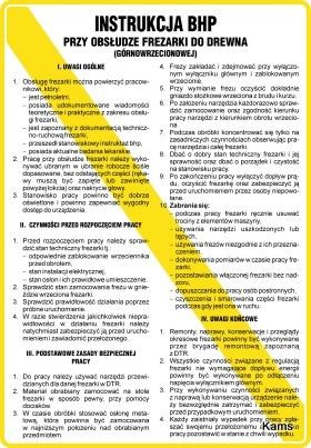 Instrukcje BHP frezarki górnowrzecionowej do drewnaoferujemy w postaci plansz w rozmiarze 245x350mm wykonanych bardzo estetycznie i trwale z elastycznej płyty HIPS grubości 0,5mm. Plansza posiada na plecach przylepce (dwustronną taśmę samoprzylepną) do przyklejenia na różne powierzchnie.Instrukcje ogólne BHP opracowane zostały zgodnie z obowiązującym prawem (art. 2374 k.p. oraz rozporządzenie MPiPS z dnia 26 września 1997 r. w sprawie ogólnych przepisów bhp). Parametry: rozmiar: 24,5 X 35 cm tworzywo: płyta pcv HIPS grubość: 0,5mm producent: TDC montaż tylko na podłożu: czystym, suchym, pozbawionym pyłów, odtłuszczonym. Instrukcja BHP– instrukcja tekstowa wypunktowana Dostępna w naszej ofercie instrukcja BHP jest bardzo czytelna, a wszelkie informacje przedstawione zostały w jasny sposób – za pomocą punktów określających przepisy BHP obowiązujące wszystkich pracowników przy obsłudze frezarki górnowrzecionowej do drewna. Na planszy znajdują się m.in. wyszczególnione ogólne przepisy bezpieczeństwa pracy, czynności zabronione przy obsłudze frezarki górnowrzecionowej do drewna oraz obowiązki każdego pracownika na stanowisku pracy. Obowiązki pracodawcyPracodawca jest obowiązany zapoznać pracowników z zasadami BHP obowiązującymi w firmie oraz zapewnić dostęp do tych informacji wszystkim pracownikom. Instrukcja BHP frezarki górnowrzecionowej do drewna powinna być umieszczona w widocznych miejscach, aby pracownicy mieli do niej łatwy dostęp. Konieczność udostępnienia takiego dokumentu pracownikom wynika z zapisów rozporządzenia Ministra Pracy i Polityki Socjalnej z 26 września 1997 r. Zgodnie z nim pracodawca ma obowiązek udostępniać, do stałego korzystania instrukcje BHP dotyczące stosowanych w zakładzie procesów technologicznych oraz wykonywania prac związanych z zagrożeniami wypadkowymi lub zagrożeniami zdrowia pracowników, obsługi maszyn i innych urządzeń technicznych, postępowania z materiałami szkodliwymi dla zdrowia i niebezpiecznymi, a także instrukcje udzielania pierwszej pomocy przedmedycznej. Wyposażenie stanowisk w instrukcje ogólne BHP podlega kontroli PIP (Państwowej Inspekcji Pracy).