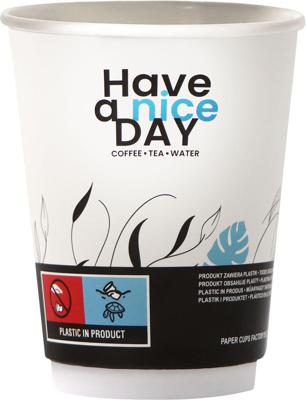 Jednorazowe kubki papierowe Have A Nice Day Double Wall, wysokiej jakości z matowym wykończeniem- firmy PAPER CUPS FACTORY. Przeznaczone do automatów vendingowych, kawomatów z napojami gorącymi, jak również sprawdzają się do napojów zimnych.
